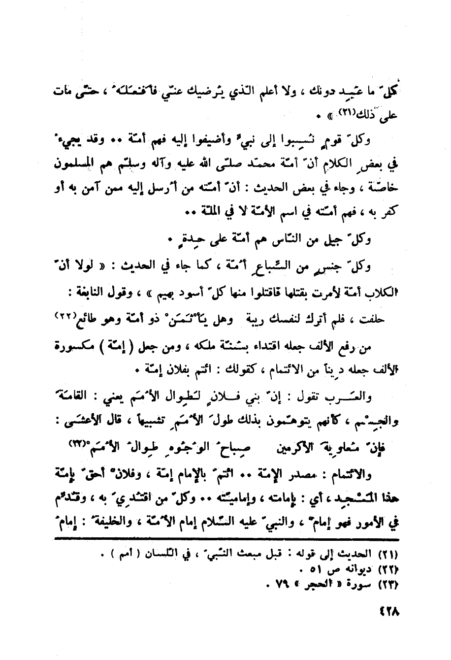 وكلّ قومٍ نُسِبوا إلى نبيٍّ وأضيفوا إليه فهم أمّة.. وقد يجيءُ في بعضِ الكلام أنّ أمّة محمّد صلّى الله عليه وآله وسلم هم المسلمون خاصّة،