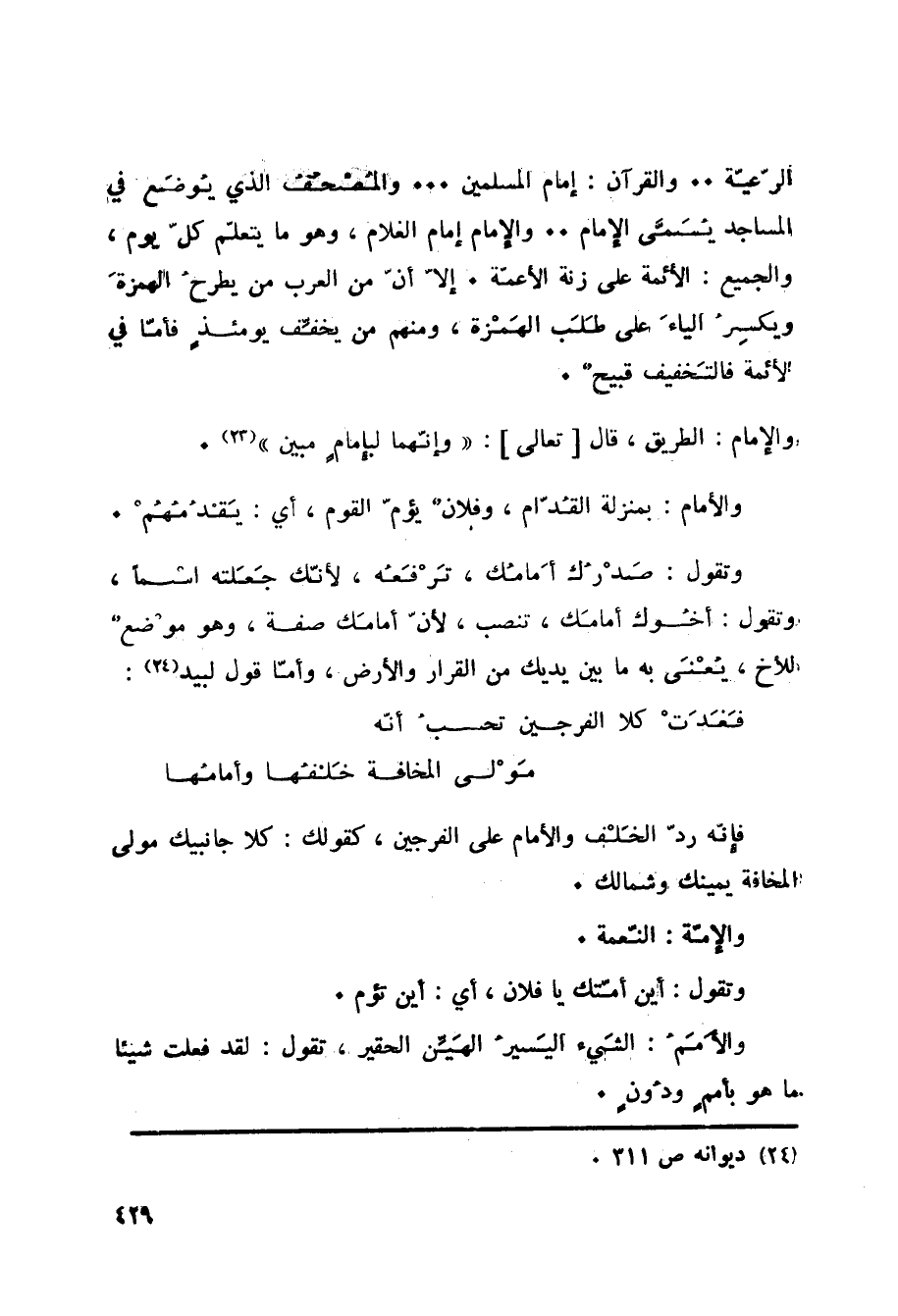 الرَعيّة.. والقرآن: إمام المسلمين ... والمُصْحَفُ الذي يُوضَعُ في المساجد يُسَمَّى الإمام.. والإمام إمام الغلام، وهو ما يتعلَم كلّ يوم، والجميع: الأئمة على زنة الأعمّة. إلاّ أنّ من العرب من يطرحُ الهمزةَ ويكسِرُ الياءَ على طَلَب الهَمْزة، ومنهم من يخفِّف يومئذٍ فأمّا في الأئمة فالتَخفيف قبيحٌ. والإمام: الطريق، قال [تعالى] : وَإِنَّهُما لَبِإِمامٍ مُبِينٍ «23» . والأمام: بمنزلة القُدّام، وفلانٌ يؤمّ القوم، أي: يَقدُمُهُمْ. وتقول: صَدْرُك أَمامُك، تَرْفَعُه، لأنّك جَعَلته اسْماً، وتقول: أخُوك أمامَك، تنصب، لأنّ أمامَك صفة، وهو موْضعٌ للأخ، يُعْنَى به ما بين يديك من القرار والأرض، وأما قول لبيد: «24»