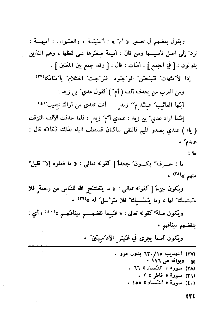 ما: ما: حرفٌ يكونُ جحداً [كقوله تعالى: ما فَعَلُوهُ إِلَّا قَلِيلٌ مِنْهُمْ «39» . ويكون جزماً [كقوله تعالى: ما يَفْتَحِ اللَّهُ لِلنَّاسِ مِنْ رَحْمَةٍ فَلا مُمْسِكَ لَها، وَما يُمْسِكْ فَلا مُرْسِلَ لَهُ «40» . ويكون صلةً كقوله تعالى: فَبِما نَقْضِهِمْ مِيثاقَهُمْ*