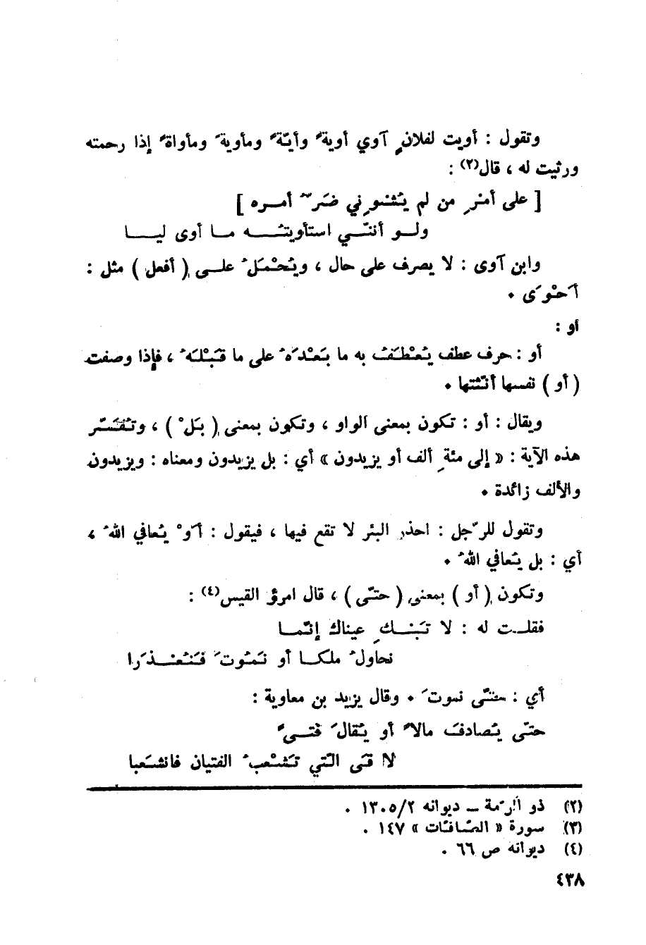 «3» أي: بل يزيدون ومعناه: ويزيدون والألف زائدة. وتقول للرّجل: احذر البئر لا تقع فيها، فيقول: أَوْ يُعافي اللهُ، أي: بل يُعافي اللهُ. وتكون (أو) بمعنى (حتّى) ، قال امرؤ القيس: «4»