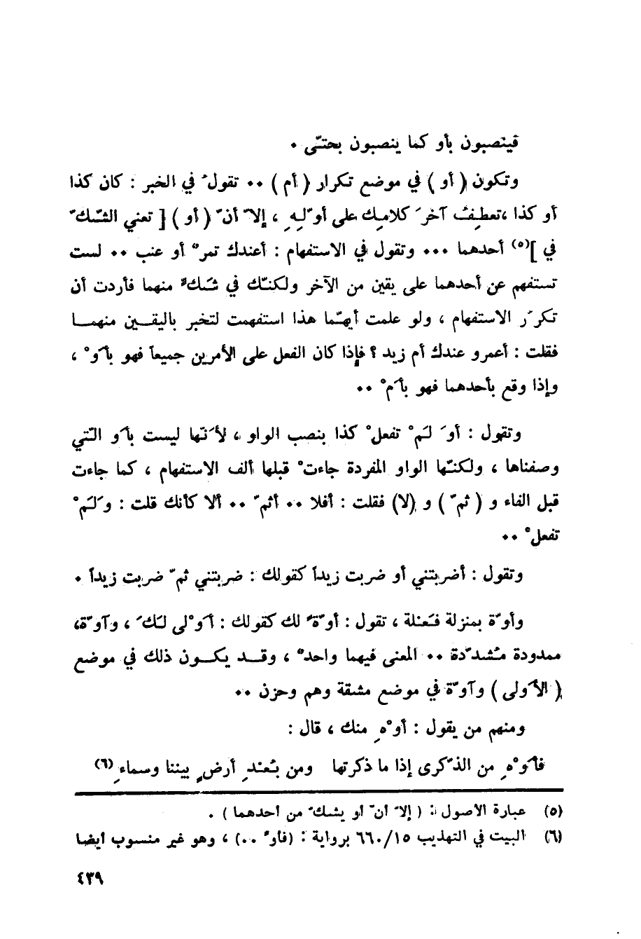 فينصبون بأو كما ينصبون بحتّى. وتكون (أو) في موضع تكرار (أم) .. تقولُ في الخبر: كان كذا أو كذا، تعطِفُ آخرَ كلامِك على أوّلِهِ، إلاّ أنّ (أو) [تعني الشّكّ في] «5» أحدهما ... وتقول في الاستفهام: أعندك تمرٌ أو عنب.. لست تستفهم عن أحدهما على يقين من الآخر ولكنّك في شَكٍّ منهما فأردت أن تكرّر الاستفهام، ولو علمت أيهّما هذا استفهمت لتخبر باليقين منهما فقلت: أعمرو عندك أم زيد؟ فإِذا كان الفعل على الأمرين جميعاً فهو بأَوْ، وإذا وقع بأحدهما فهو بأَمْ.. وتقول: أولم تفعلْ كذا بنصب الواو، لأَنّها ليست بأَو التّي وصفناها، ولكنّها الواو المفردة جاءتْ قبلها ألف الاستفهام، كما جاءت قبل الفاء و (ثمّ) و (لا) فقلت: أفلا.. أثمّ.. ألا كأنك قلت: وَلَمْ تفعلْ.. وتقول: أضربتني أو ضربت زيداً كقولك: ضربتني ثمّ ضربت زيداً. وأوّة بمنزلة فَعلة، تقول: أوّةً لك كقولك: أَوْلى لَكَ، وآوّة، ممدودة مُشدّدة.. المعنى فيهما واحدٌ، وقد يكون ذلك في موضع (الأَولى) وآوّة في موضع مشقة وهم وحزن.. ومنهم من يقول: أوْهِ منك، قال: