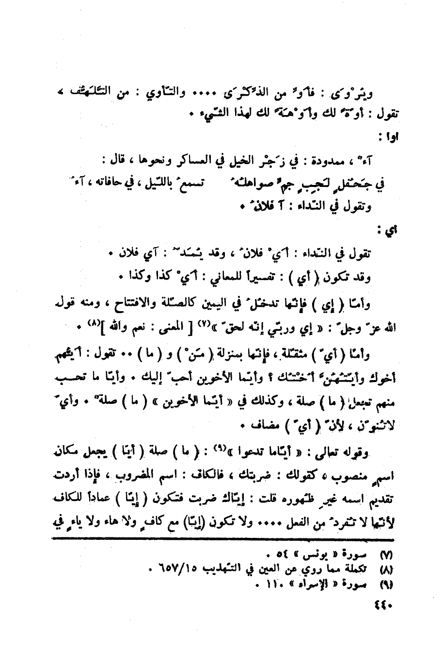 «7» . [المعنى: نعم والله] «8» . وأمّا (أيّ) مثقّلة، فإِنّها بمنزلة (من) و (ما) .. تقول: أَيُّهم أخوك وأيّتُهُنَّ أُخْتُك؟ وأيّما الأخوين أحبّ إليك. وأيّا ما تحب منهم تجعل (ما) صلة، وكذلك في أيّما الأخوين (ما) صلةٌ. وأيّ لا تُنوّن، لأنّ (أيّ) مضاف. وقوله تعالى: أَيًّا ما تَدْعُوا «9» : (ما) صلة (أيّا) يجعل مكان اسمٍ منصوب، كقولك: ضربتك، فالكاف: اسم المضروب، فإِذا أردت تقديم اسمه غيرِ ظُهوره قلت: إيّاك ضربت فتكون (إِيّا) عماداً للكاف لأنّها لا تُفردُ من الفعل.... ولا تكون (إيّا) مع كافٍ ولا هاء ولا ياءٍ في