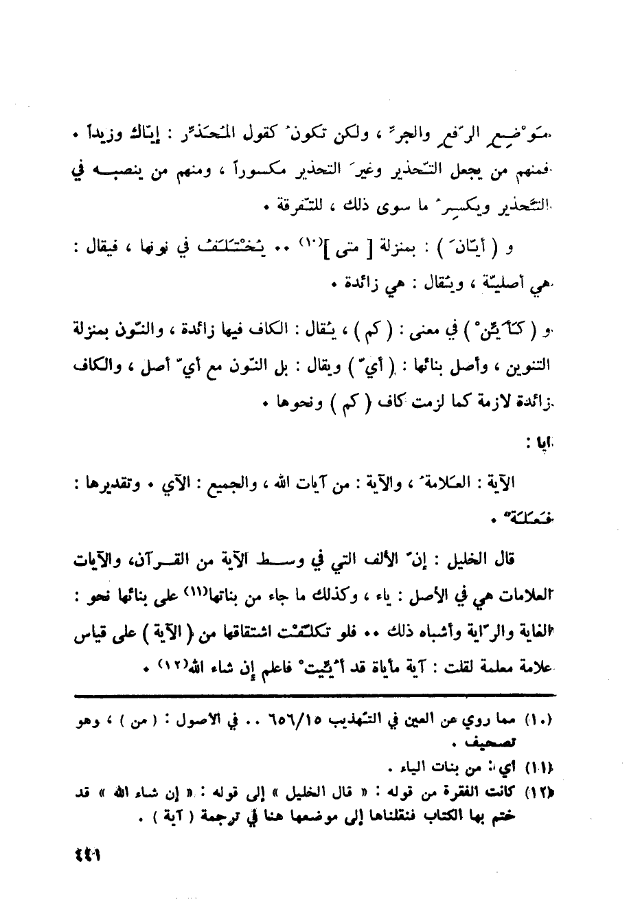 (12) كانت الفقرة من قوله: قال الخليل إلى قوله: إن شاء الله قد ختم بها الكتاب فنقلناها إلى موضعها هنا في ترجمة (آية) .