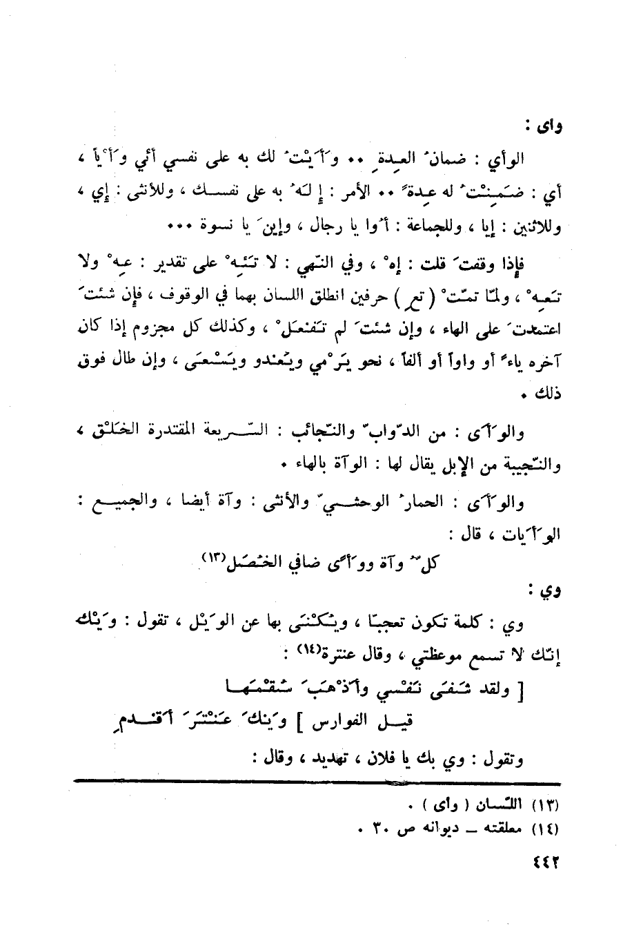 وأى: الوأي: ضمانُ العِدةِ.. وَأَيْتُ لك به على نفسي أئي وَأْياً، أي: ضَمِنْتُ له عِدةً.. الأمر: إِلَهُ به على نفسك، وللأنثى: إي، وللاثنين: إيا، وللجماعة: أُوا يا رجال، وإينَ يا نسوة ... فإِذا وقفتَ قلت: إهْ، وفي النّهي: لا تَئِهْ على تقدير: عِهْ ولا تَعِهْ، ولمّا تمّتْ (تعِ) حرفين انطلق اللسان بهما في الوقوف، فإِن شئتّ اعتمدتَ على الهاء، وإن شئتَ لم تَفعَلْ، وكذلك كل مجزوم إذا كان آخره ياءً أو واواً أو ألفاً، نحو يَرْمي ويَعدو ويَسْعَى، وإن طال فوق ذلك. والوَأَى: من الدّوابّ والنّجائب: السّريعة المقتدرة الخَلْق، والنّجيبة من الإبل يقال لها: الوآة بالهاء. والوَأَى: الحمارُ الوحشيّ والأنثى: وآة أيضا، والجميع: الوَأَيات، قال: