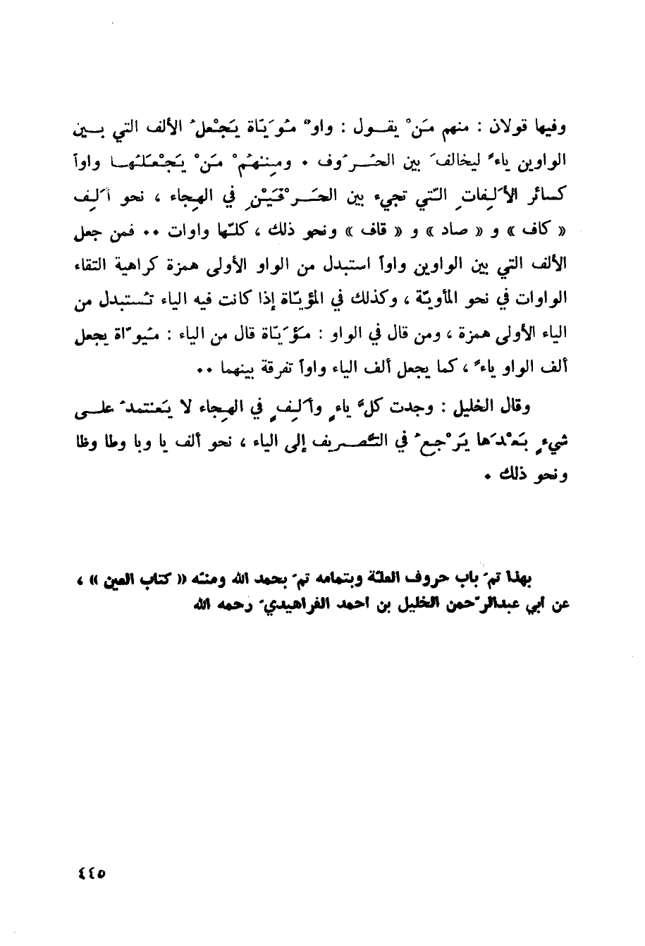 بهذا تم باب حروف العلة وبتمامه تم بحمد الله ومنه كتاب العين، عن أبي عبد الرحمن الخليل بن أحمد الفراهيدي رحمه الله.