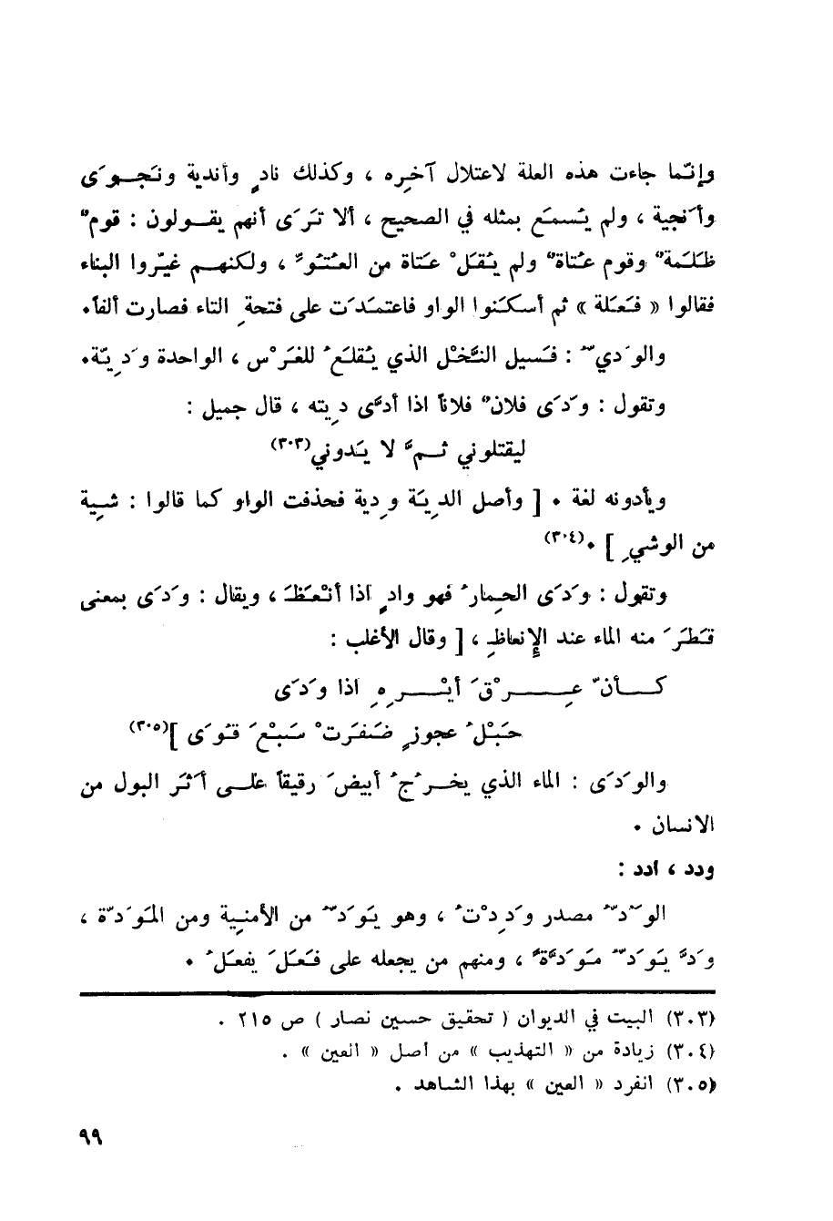 وإنّما جاءت هذه العلة لاعتلال آخِره، وكذلك نادٍ وأندية ونَجوَى وأَنجية، ولم يُسمَع بمثله في الصحيح، ألا ترى أنهم يقولون: قومٌ ظَلَمةٌ وقوم عُتاةٌ ولم يقل عتاة من العُتُوِّ، ولكنهم غيّروا البناء فقالوا فَعَلة ثم أسكَنوا الواو فاعتمَدَت على فتحة التاء فصارت ألفا. والوادي: فَسيل النَّخْل الذي يُقلَعُ للغرس، الواحدة وَدِيّة. وتقول: وَدَى فلانٌ فلاناً إذا أدَّى دِيته، قال جميل: