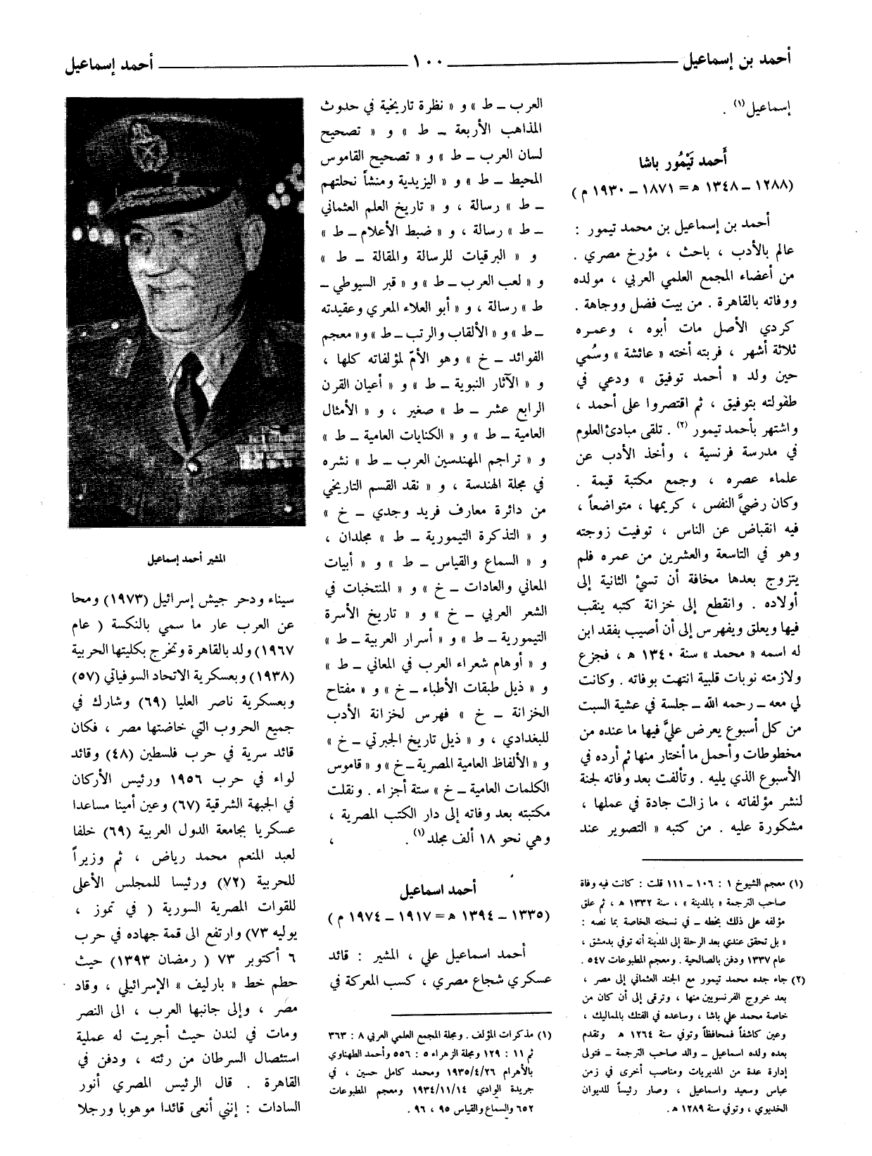 سيناء ودحر جيش إسرائيل (1973) ومحا عن العرب عار ما سمي بالنكسة (عام 1967) ولد بالقاهرة وتخرج بكليتها الحربية (1938) وبعسكرية الاتحاد السوفياتي (57) وبعسكرية ناصر العليا (69) وشارك في جميع الحروب التي خاضتها مصر، فكان قائد سرية في حرب فلسطين (48) وقائد لواء في حرب 1956 ورئيس الأركان في الجبهة الشرقية (67) وعين أمينا مساعدا عسكريا بجامعة الدول العربية (69) خلفا لعبد المنعم محمد رياض، ثم وزيرا للحربية (72) ورئيسا للمجلس الأعلى للقوات المصرية السورية (في تموز، يوليه 73) وارتفع الى قمة جهاده في حرب 6 أكتوبر 73 (رمضان 1393) حيث حطم خط (بارليف) الإسرائيلي، وقاد مصر، وإلى جانبها العرب، الى النصر ومات في لندن حيث أجريت له عملية استئصال السرطان من رئته، ودفن في القاهرة. قال الرئيس المصري أنور السادات: إنني أنعى قائدا موهوبا ورجلا