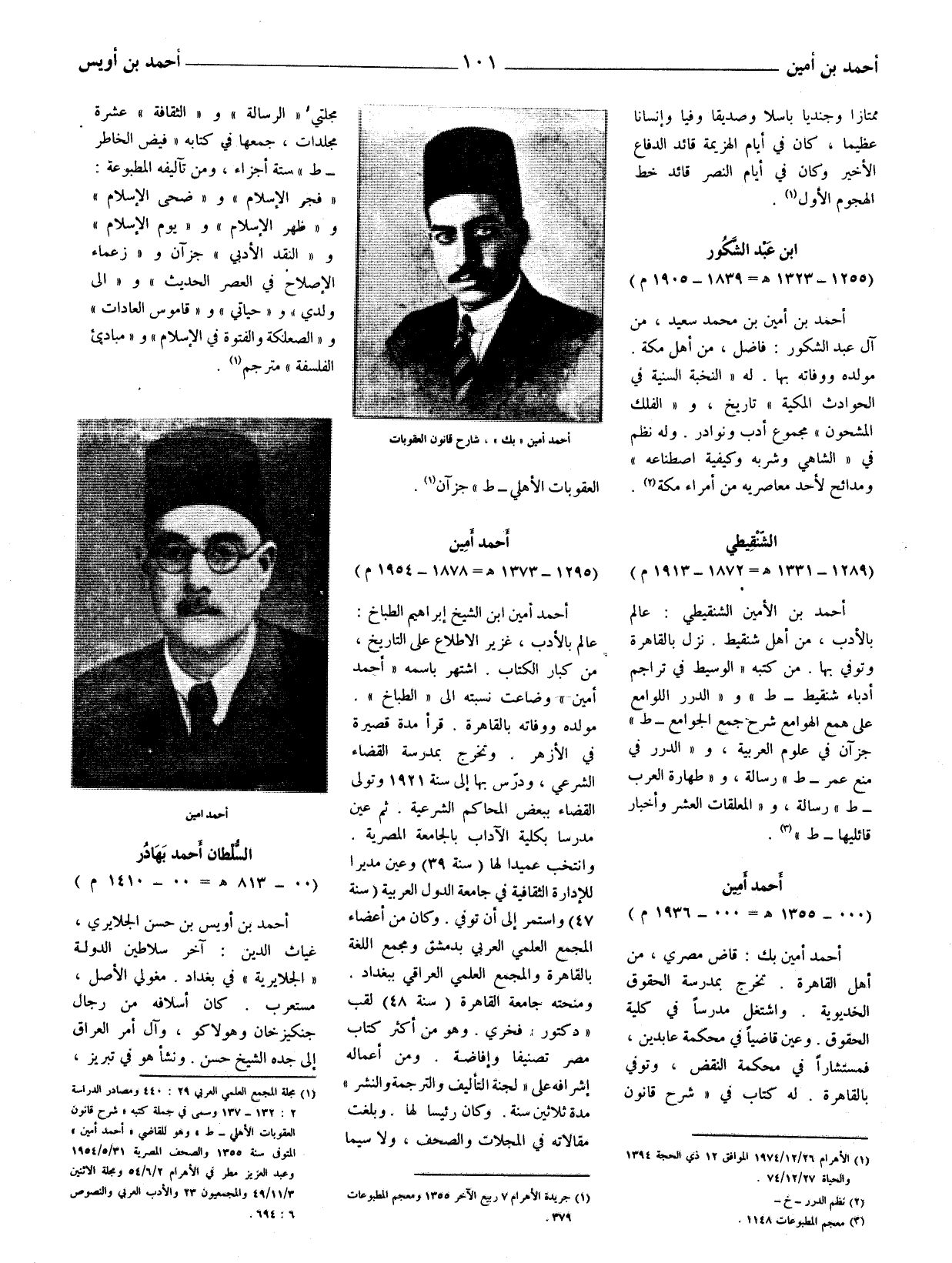 (1) مجلة المجمع العلمي العربيّ 29: 440 ومصادر الدراسة: 213:2 - 137 وسمى في جملة كتبه (شرح قانون العقوبات الأهلي - ط) وهو للقاضي (أحمد أمين) المتوفى سنة 1355 والصحف المصرية 31 / 5 / 1954 وعبد العزيز مطر في الأهرام 2 / 6 / 54