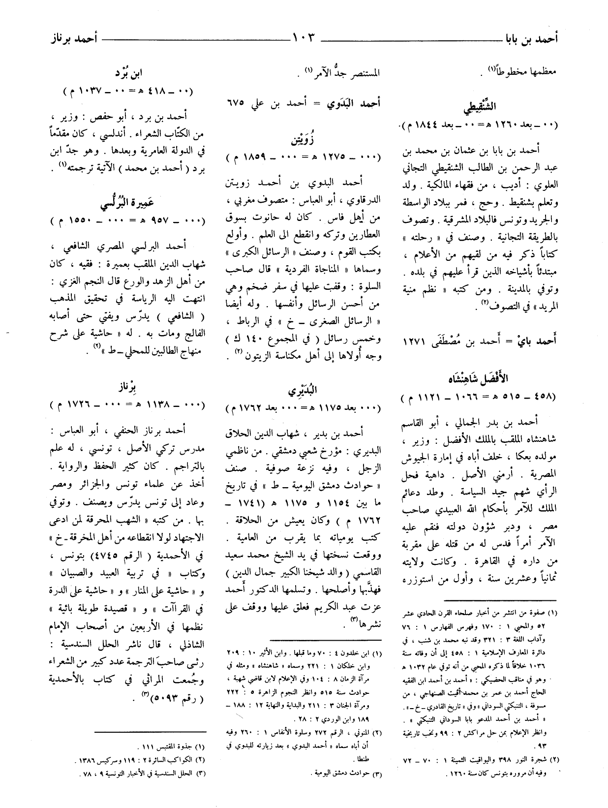 (1) صفوة من انتشر من أخبار صلحاء القرن الحادي عشر 52 والمحبي 1: 170 وفهرس الفهارس 1: 76 وآداب اللغة 321 3 وقد نبه محمد بن شنب، في دائرة المعارف الإسلامية 1: 458 إلى أن وفاته سنة 1036 خلافا لما ذكره المحبي من أنه تئفي عام 1032هـ وهو في مناقب الحضيكي: (أحمد بن أحمد بن الفقيه الحاج أحمد بن عمر بن محمد أقيت الصنهاجي، من مسوفة، التنبكتي السوداني) وفي (تاريخ القادري - خ -) .