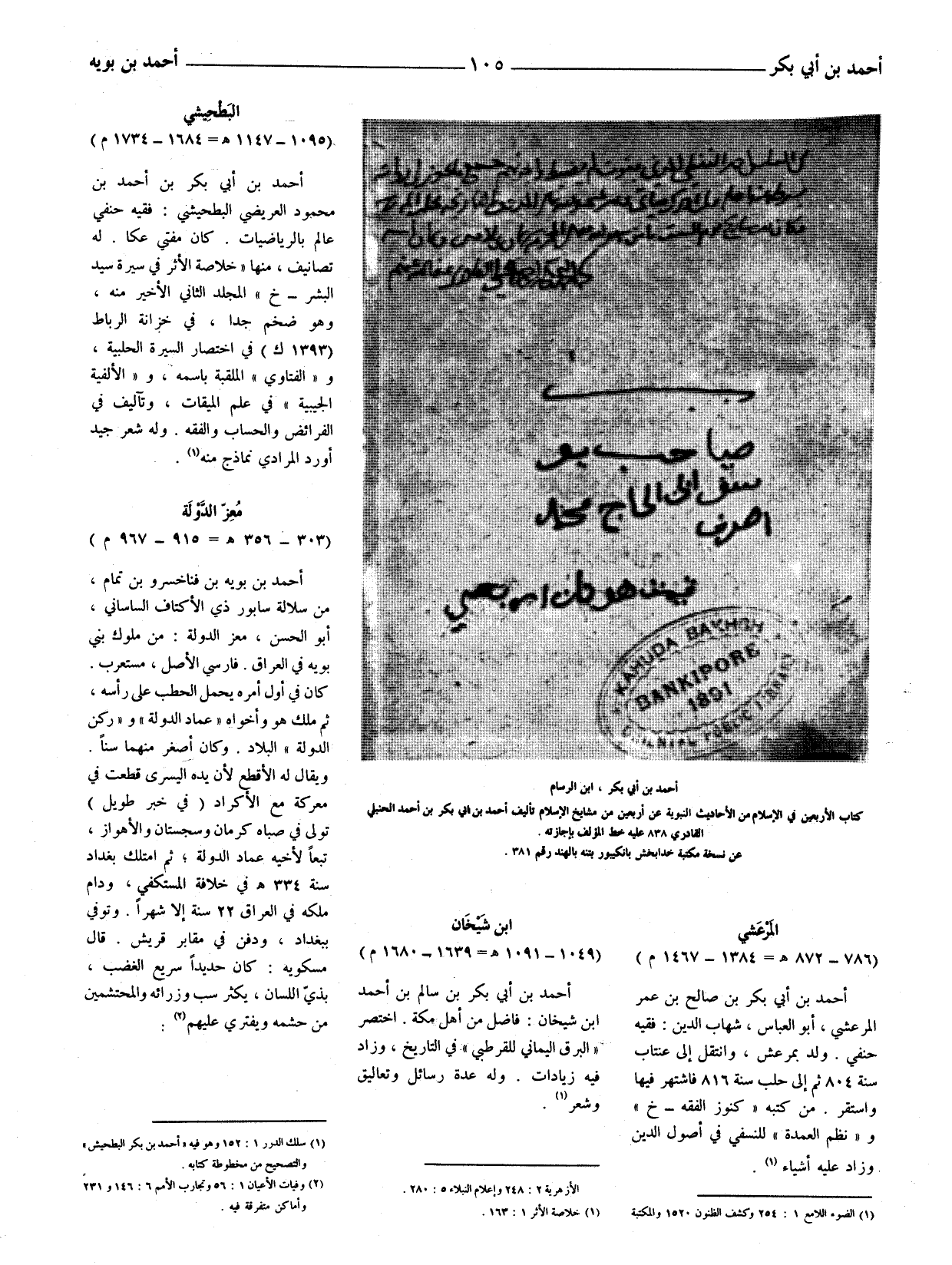 (1) سلك الدرر 1: 152 وهو فيه (أحمد بن بكر البطحيش) والتصحيح من مخطوطة كتابه.