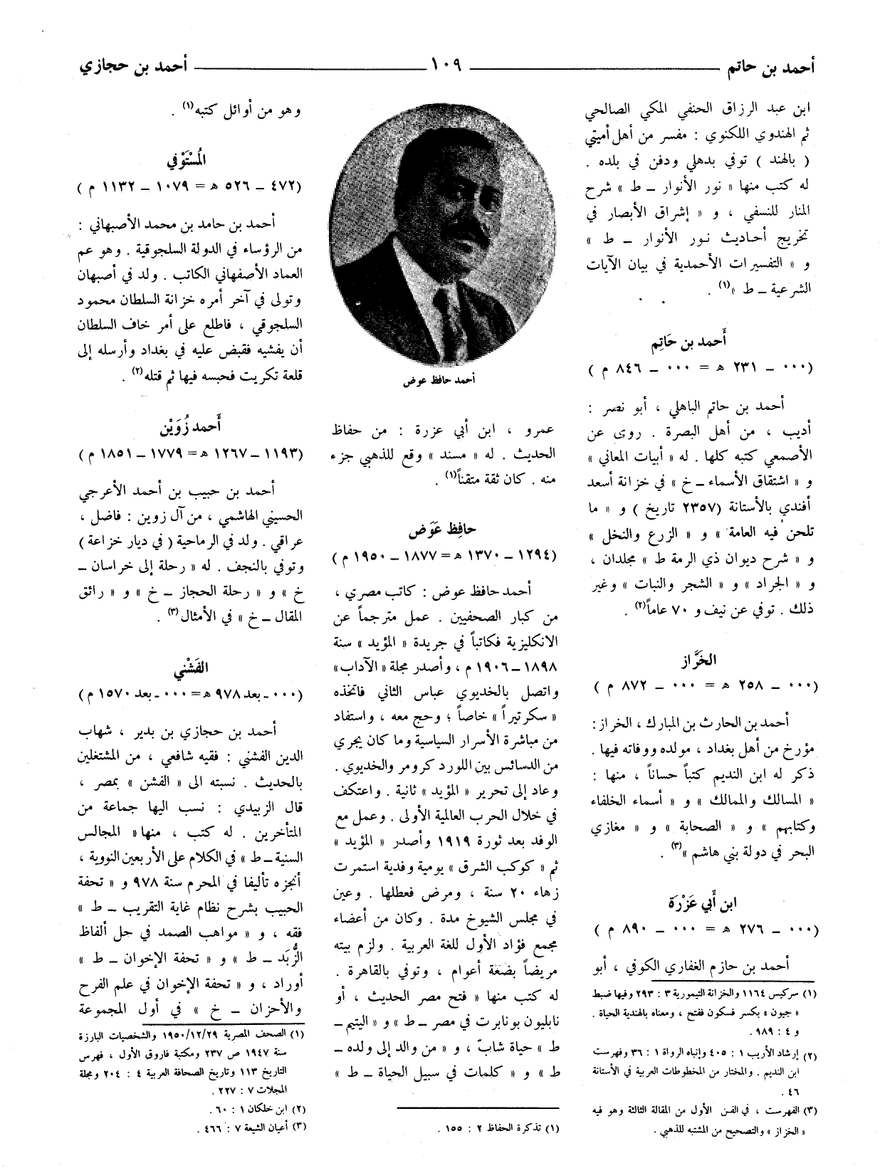 أحمد حافظ عوض: كاتب مصري، من كبار الصحفيين. عمل مترجما عن الانكليزية فكاتبا في جريدة (المؤيد) سنة 1898 - 1906 م، وأصدر مجلة (الآداب) واتصل بالخديوي عباس الثاني فاتخذه (سكرتيرا) خاصا، وحج معه، واستفاد من مباشرة الأسرار السياسية وما كان يجري من الدسائس بين اللورد كرومر والخديوي. وعاد إلى تحرير (المؤيد) ثانية. واعتكف في خلال الحرب العالمية الأولى. وعمل مع الوفد بعد ثورة 1919 وأصدر (المؤيد) ثم (كوكب الشرق) يومية وفدية استمرت زهاء 20 سنة، ومرض فعطلها. وعين في مجلس الشيوخ مدة. وكان من أعضاء مجمع فؤاد الأول للغة العربية. ولزم بيته مريضا بضعة أعوام، وتوفي بالقاهرة. له كتب منها (فتح مصر الحديث، أو نابليون بونابرت في مصر - ط) و (اليتيم - ط) حياة شابّ، و (من والد إلى ولده - ط) و (كلمات في سبيل الحياة - ط)