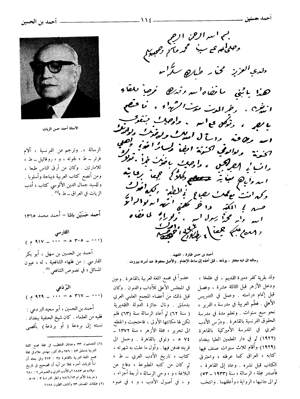(1) المجمعيون 33 وعدنان الخطيب في مجلة مجمع اللغة العربية بدمشق 43: 676 والدكتور مهدي علام في مجلة مجمع اللغة العربية بالقاهرة 24: 213 وفي بحثه أن ابنا للزيات أخبره نقلا عن أبيه أن الصحيح في تاريخ ميلاده هو 1883؟ والأدب العربيّ والنصوص 6: 680 وجريدة الأهرام 14 / 6 / 68 وانظر الدراسة 3: 507.