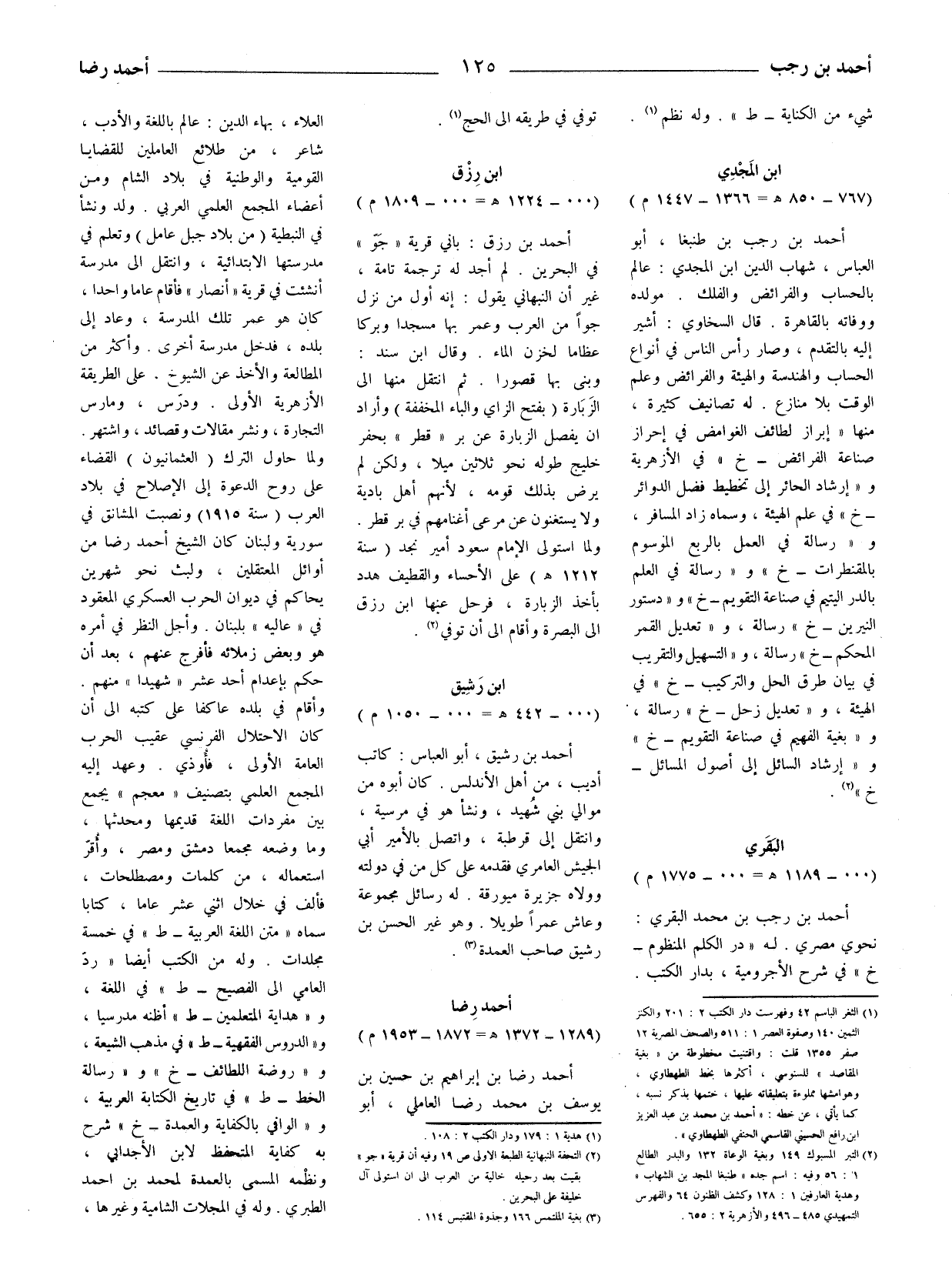 أحمد بن رجب بن طنبغا، أبو العباس، شهاب الدين ابن المجدي: عالم بالحساب والفرائض والفلك. مولده ووفاته بالقاهرة. قال السخاوي: أشير إليه بالتقدم، وصار رأس الناس في أنواع الحساب والهندسة والهيئة والفرائض وعلم الوقت بلا منازع. له تصانيف كثيرة، منها (إبراز لطائف الغوامض في إحراز صناعة الفرائض - خ) في الأزهرية و (إرشاد الحائر إلى تخطيط فضل الدوائر - خ) في علم الهيئة، وسماه زاد المسافر، و (رسالة في العمل بالربع الموسوم بالمقنطرات - خ) و (رسالة في العلم بالدر اليتيم في صناعة التقويم - خ) و (دستور النيرين - خ) رسالة، و (تعديل القمر المحكم - خ) رسالة، و (التسهيل والتقريب في بيان طرق الحل والتركيب - خ) في الهيئة، و (تعديل زحل - خ) رسالة، و (بغية الفهيم في صناعة التقويم - خ) و (إرشاد السائل إلى أصول المسائل - خ) (2) .