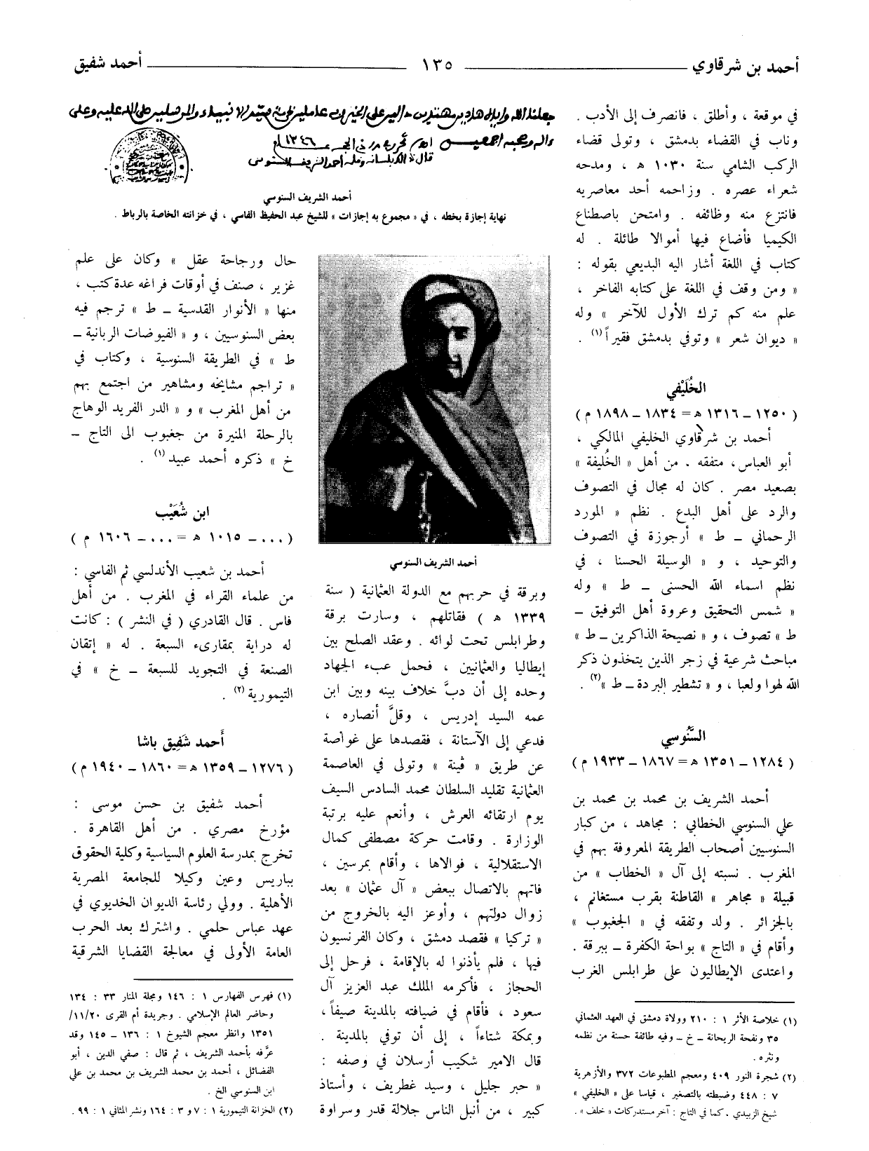وجريدة أم القرى 20 / 11 / 1351 وانظر معجم الشيوخ 1: 136 - 145 وقد عرّفه بأحمد الشريف، ثم قال: صفي الدين، أبو الفضائل، أحمد بن محمد الشريف بن محمد بن علي ابن السنوسي إلخ.