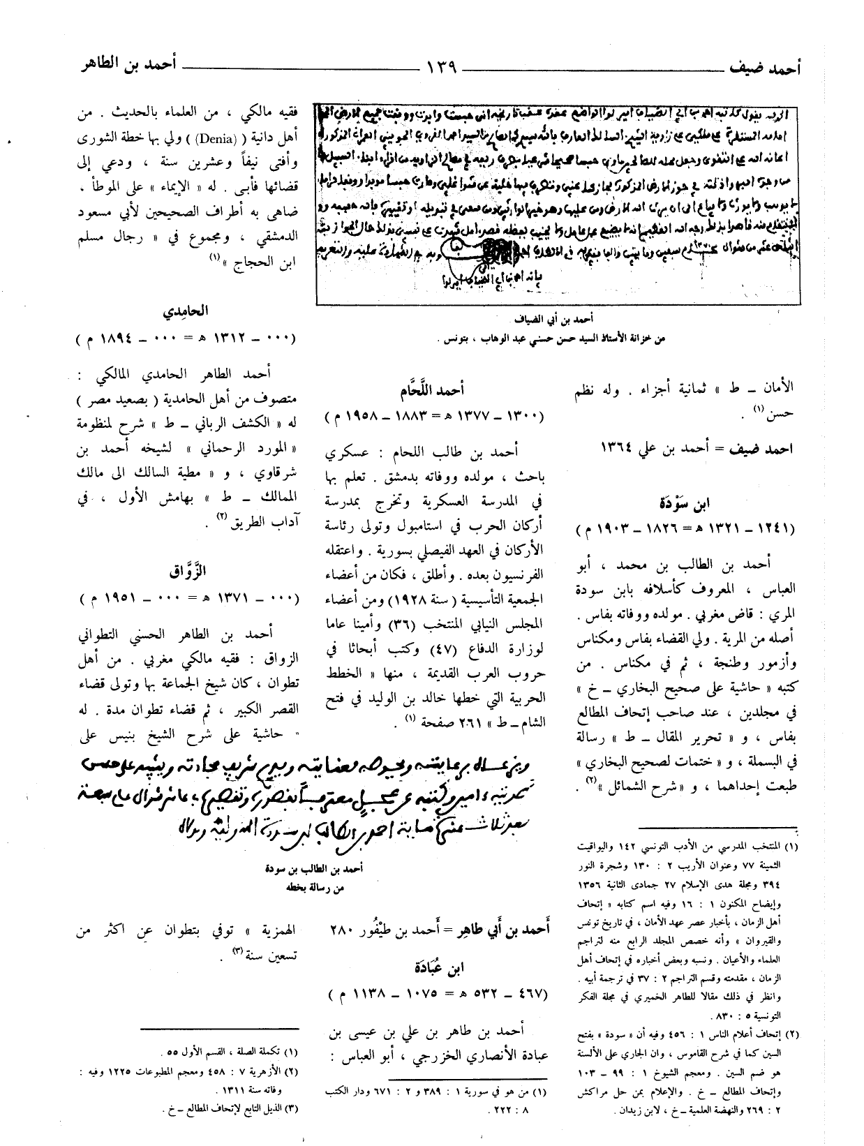 (1) المنتخب المدرسي من الأدب التونسي 142 واليواقيت الثمينة 77 وعنوان الأريب 2: 130 وشجرة النور 394 ومجلة هدى الإسلام 27 جمادى الثانية 1356 وإيضاح المكنون 1: 16 وفيه اسم كتابه (إتحاف أهل الزمان، بأخبار عصر عهد الأمان، في تاريخ تونس والقيروان) وأنه خصص المجلد الرابع منه لتراجم العلماء والأعيان. ونسبه وبعض أخباره في إتحاف أهل الزمان، مقدمته وقسم التراجم 2: 37 في ترجمة أبيه. وانظر في ذلك مقالا للطاهر الخميري في مجلة الفكر التونسية 5: 830.