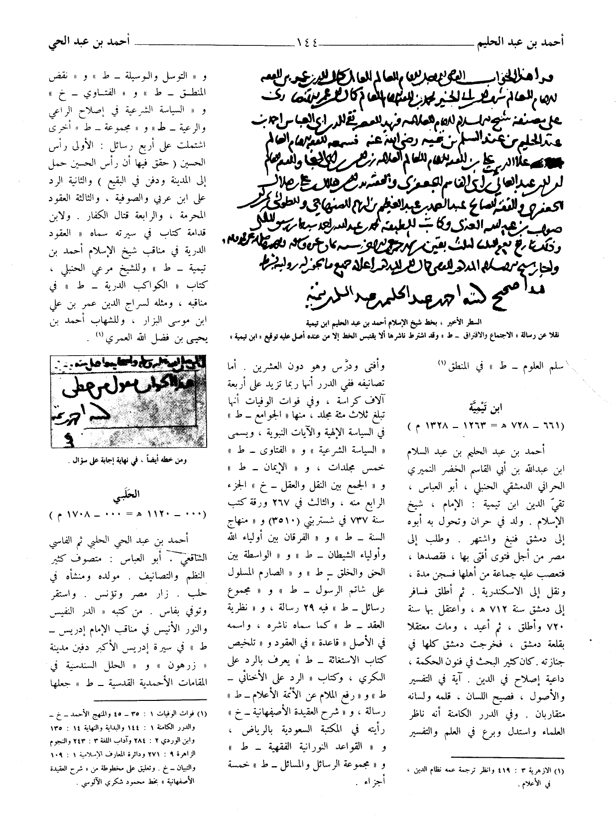 أحمد بن عبد الحليم بن عبد السلام ابن عبد الله بن أبي القاسم الخضر النميري الحراني الدمشقيّ الحنبلي، أبو العباس، تقي الدين ابن تيمية: الإمام، شيخ الإسلام. ولد في حران وتحول به أبوه إلى دمشق فنبغ واشتهر. وطلب إلى مصر من أجل فتوى أفتى بها، فقصدها، فتعصب عليه جماعة من أهلها فسجن مدة، ونقل إلى الإسكندرية. ثم أطلق فسافر إلى دمشق سنة 712 هـ واعتقل بها سنة 720 وأطلق، ثم أعيد، ومات معتقلا بقلعة دمشق، فخرجت دمشق كلها في جنازته. كان كثير البحث في فنون الحكمة، داعية إصلاح في الدين. آية في التفسير والأصول، فصيح اللسان، قلمه ولسانه متقاربان. وفي الدرر الكامنة أنه ناظر العلماء واستدل وبرع في العلم والتفسير