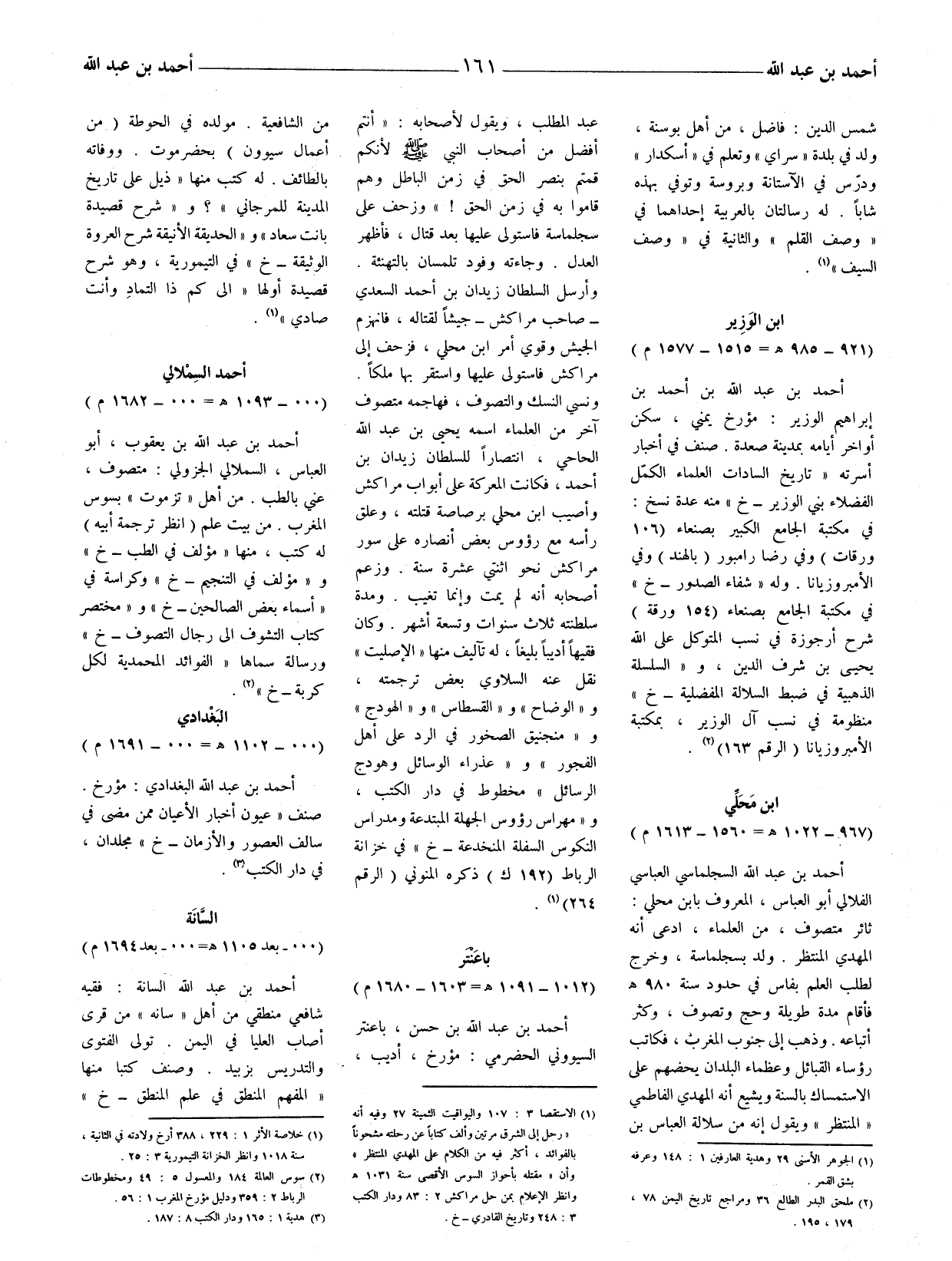 (1) الاستقصا 3: 107 واليواقيت الثمينة 27 وفيه أنه (رحل إلى الشرق مرتين وألف كتابا عن رحلته مشحونا بالفوائد، أكثر فيه من الكلام على المهدي المنتظر) وأن (مقتله بأحواز السوس الأقصى سنة 1031هـ وانظر الإعلام بمن حل مراكش 2: 83 ودار الكتب 3: 248 وتاريخ القادري - خ.