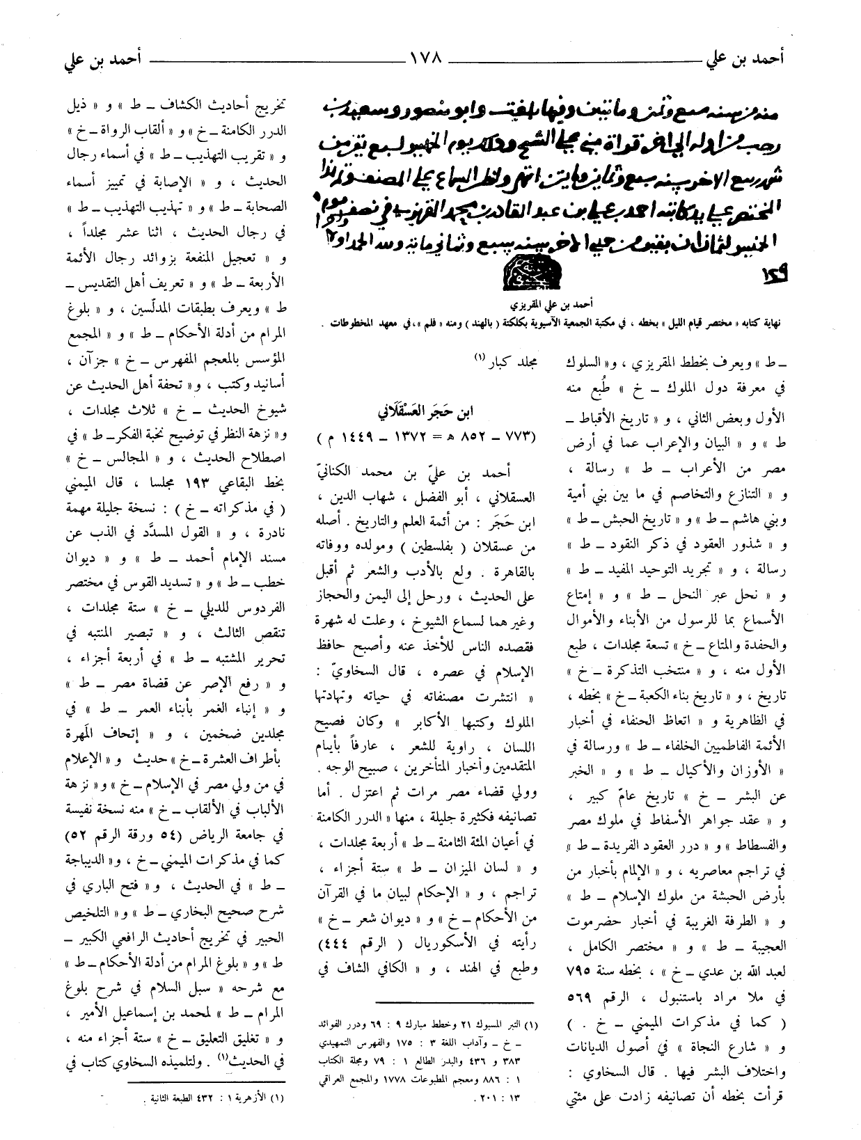 أحمد بن علي بن محمد الكناني العسقلاني، أبو الفضل، شهاب الدين، ابن حَجَر: من أئمة العلم والتاريخ. أصله من عسقلان (بفلسطين) ومولده ووفاته بالقاهرة. ولع بالأدب والشعر ثم أقبل على الحديث، ورحل إلى اليمن والحجاز وغيرهما لسماع الشيوخ، وعلت له شهرة فقصده الناس للأخذ عنه وأصبح حافظ الإسلام في عصره، قال السخاويّ: (انتشرت مصنفاته في حياته وتهادتها الملوك وكتبها الأكابر) وكان فصيح اللسان، راوية للشعر، عارفا بأيام المتقدمين وأخبار المتأخرين، صبيح الوجه. وولي قضاء مصر مرات ثم اعتزل. أما تصانيفه فكثيرة جليلة، منها (الدرر الكامنة في أعيان المئة الثامنة - ط) أربعة مجلدات، و (لسان الميزان - ط) ستة أجزاء، تراجم، و (الإحكام لبيان ما في القرآن من الأحكام - خ) و (ديوان شعر - خ) رأيته في الاسكوريال (الرقم 444) وطبع في الهند، و (الكافي الشاف في