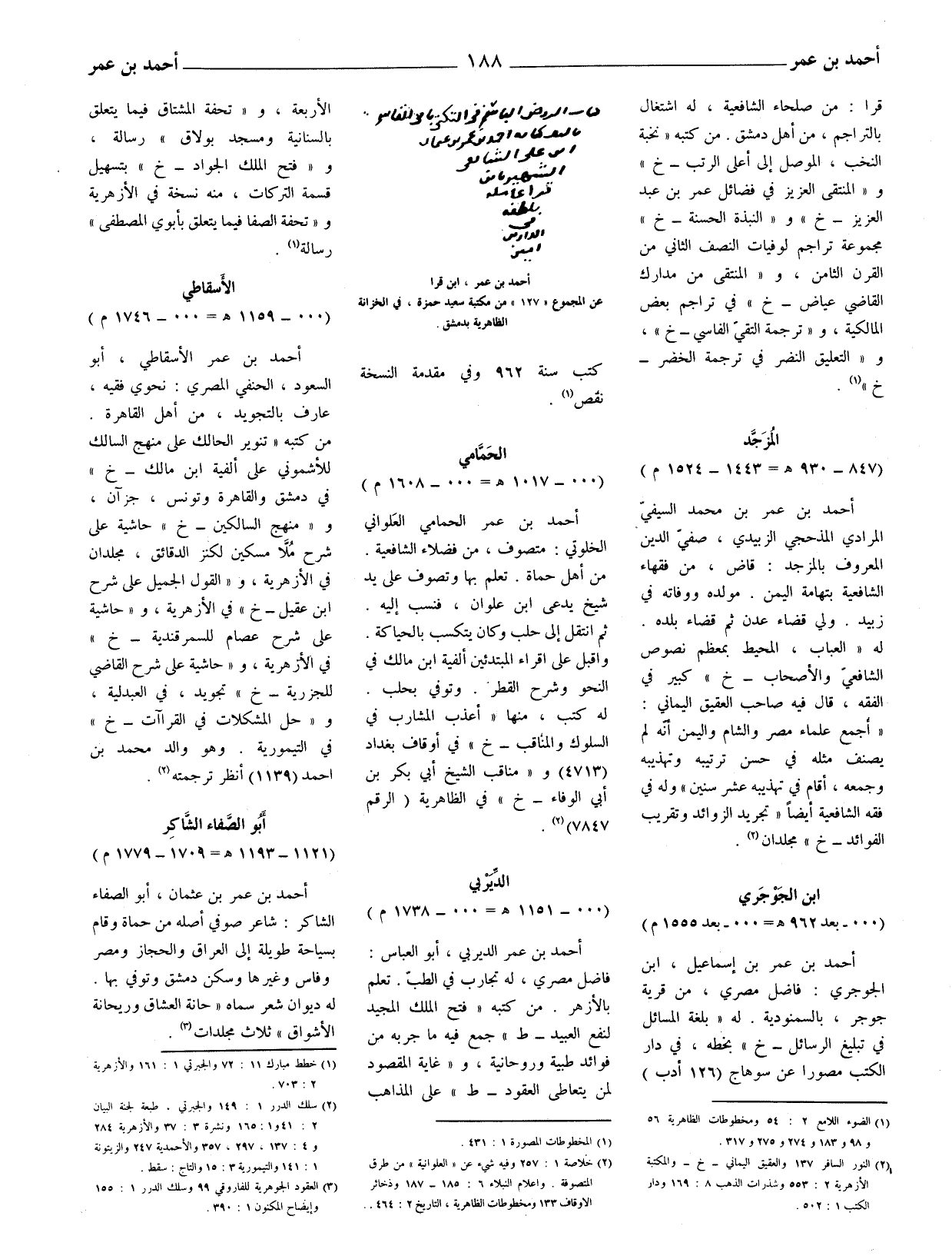 (2) سلك الدرر 1: 149 والجبرتي. طبعة لجنة البيان 2: 41 و 1: 165 ونشرة 3: 37 والأزهرية 284 و 4: 137، 297، 357 والأحمدية 247 والزيتونة 1: 141 والتيمورية 3: 15 والتاج: سقط.