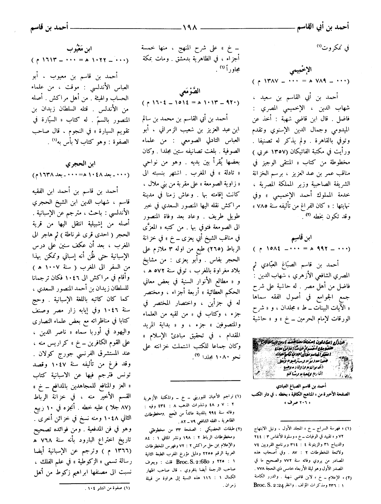 أحمد بن قاسم بن أحمد ابن الفقيه قاسم، شهاب الدين ابن الشيخ الحجري الأندلسي: باحث، مترجم عن الإسبانية. أصله من إشبيلية انتقل إليها من قرية الحجر (احدى قرى غرناطة) ثم هاجر إلى المغرب، بعد أن عكف سنين على درس الإسبانية حتى ظن أنه إسباني وتمكن بهذا من السفر إلى المغرب (سنة 1007 هـ) وأقام في مراكش الى 1046 فكان ترجمانا للسلطان زيدان بن أحمد المنصور السعدي، كما كان كاتبه باللغة الإسبانية. وحج سنة 1046 وفي إيابه زار مصر وصنف كتابا في مناظراته مع بعض علماء النصارى واليهود في أوربا سماه (ناصر الدين، على القوم الكافرين - خ) كراريس منه، عند المستشرق الفرنسي جورج كولان. وقد فرغ من تأليفه سنة 1047 وقصد تونس فترجم فيها عن الاسبانية كتاب (العز والمنافع للمجاهدين بالمدافع - خ) القسم الأخير منه، في خزانة الرباط (87 جلا) عليه خطه. أنجزه في 10 ربيع الثاني 1048 ومنه نسخ في خزائن أخرى. وهو في فن المدفعية. ومن فوائده تصحيح تاريخ اختراع البارود بأنه سنة 768 هـ (1366 م) وترجم عن الإسبانية أيضا رسالة تسمى (الزكوطية) في علم الفلك، نسبت الى مصنفها إبراهيم زكوط من أهل