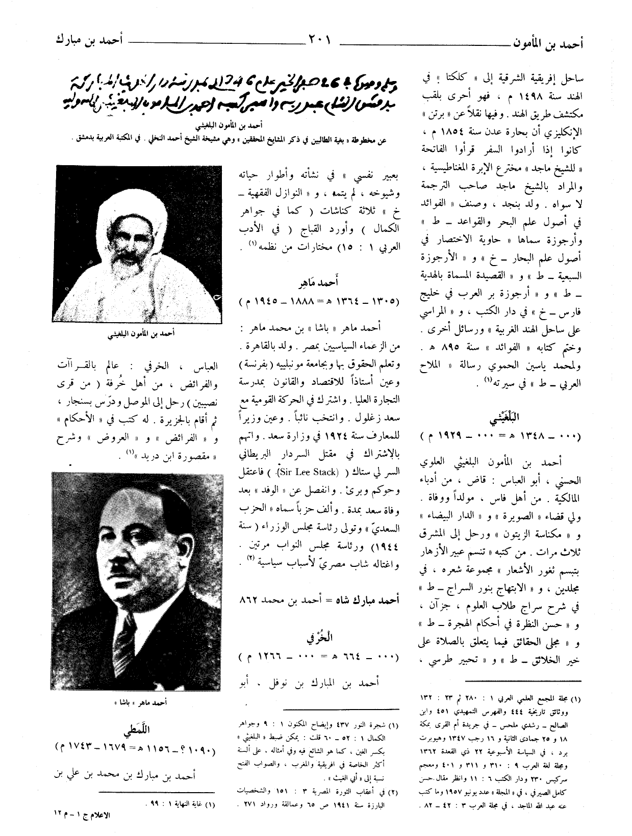 أحمد ماهر (باشا) بن محمد ماهر: من الزعماء السياسيين بمصر. ولد بالقاهرة. وتعلم الحقوق بها وبجامعة مونبلييه (بفرنسة) وعين أستاذا للاقتصاد والقانون بمدرسة التجارة العليا. واشترك في الحركة القومية مع سعد زغلول. وانتخب نائبا. وعين وزيرا للمعارف سنة 1924 في وزارة سعد. واتهم بالاشتراك في مقتل السردار البريطاني السرلي ستاك ((Sir Lee Stack)) فاعتقل وحوكم وبرئ. وانفصل عن (الوفد) بعد وفاة سعد بمدة. وألف حزبا سماه (الحزب السعديّ) وتولى رئاسة مجلس الوزراء (سنة1944 هـ) ورئاسة مجلس النواب مرتين. واغتاله شاب مصريّ لأسباب سياسية (2) .