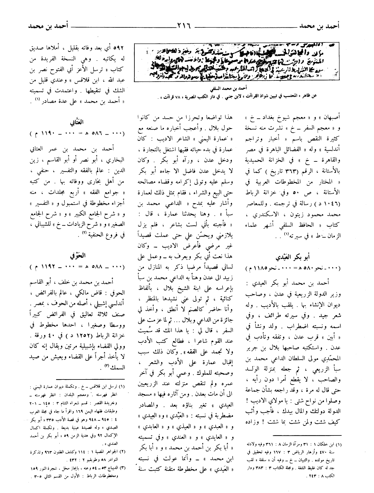 أحمد بن محمد بن عمر العتابي البخاري، أبو نصر أو أبو القاسم زين الدين: عالم بالفقه والتفسير، حنفي، من أهل بخارى ووفاته بها. من كتبه (جوامع الفقه) أربع مجلدات، منه (أجزاء مخطوطة في استمبول و (التفسير) و (شرح الجامع الكبير) و (شرح الجامع الصغير) و (شرح الزيادات - خ) للشيباني، في فروع الحنفية (2) الحَوْفي (000 - 588 هـ = 000 - 1192 م) أحمد بن محمد بن خلف، أبو القاسم الحوفي: قاض مالكي، عالم بالفرائض، أندلسي إشبيلي، أصله من الحوف، بمصر. صنف ثلاثة تعاليق في الفرائض كبيرا ووسطا وصغيرا، أحدها مخطوط في خزانة الرباط (1252 د) في 40 ورقة. وولي القضاء بإشبيليّة مرتين ويقال إنه كان لا يأخذ أجرا على القضاء ويعيش من صيد السمك (3) .