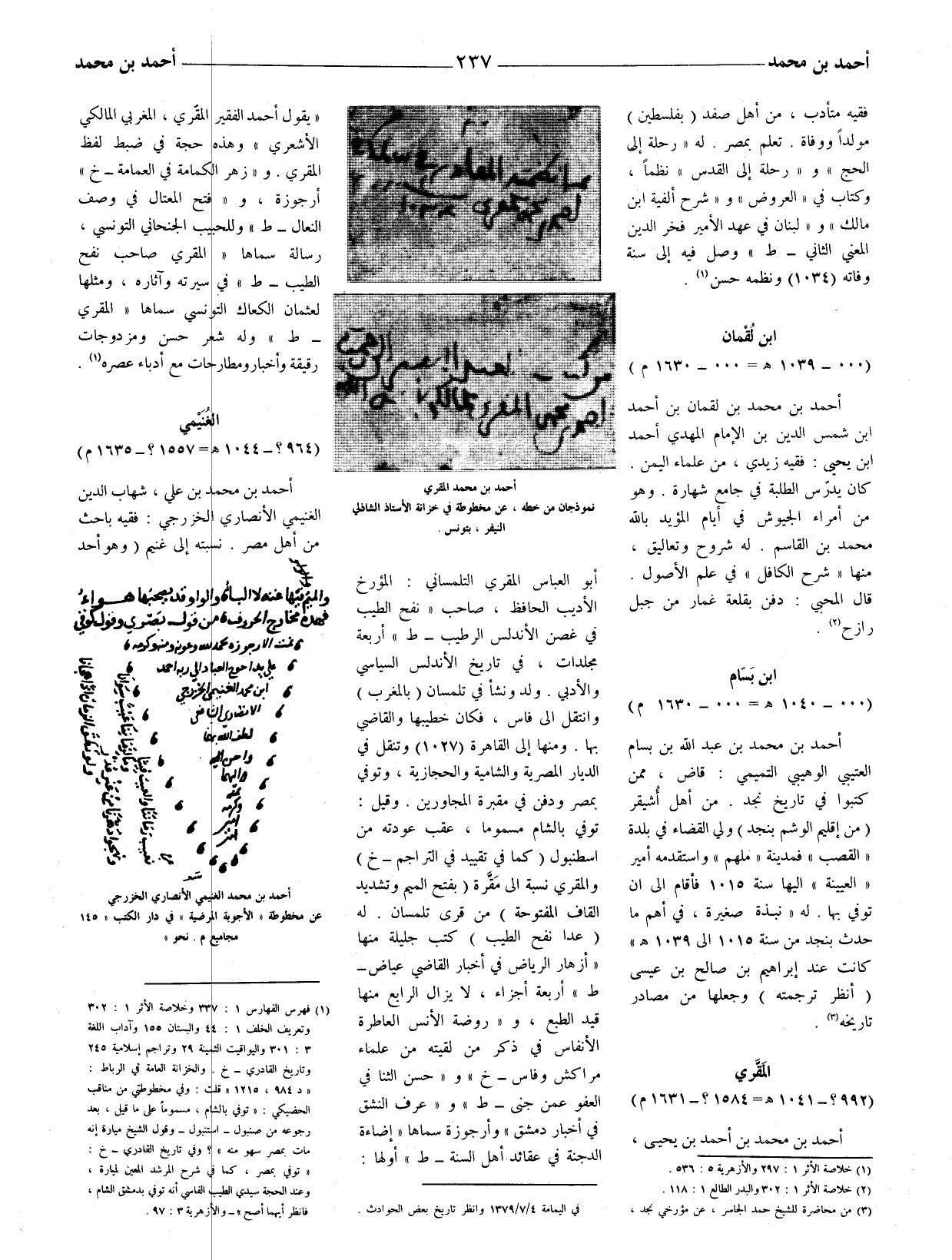 المؤرخ الأديب الحافظ، صاحب (نفح الطيب في غصن الأندلس الرطيب - ط) أربعة مجلدات، في تاريخ الأندلس السياسي والأدبي. ولد ونشأ في تلمسان (بالمغرب) وانتقل إلى فاس، فكان خطيبها والقاضي بها. ومنها الى القاهرة (1027) وتنقل في الديار المصرية والشامية والحجازية، وتوفي بمصر ودفن في مقبرة المجاورين. وقيل: توفي بالشام مسموما، عقب عودته من إسطنبول (كما في تقييد في التراجم - خ) والمقري نسبة الى مَقَّرَة (بفتح الميم وتشديد القاف المفتوحة) من قرى تلمسان. له (عدا نفح الطيب) كتب جلية منها (أزهار الرياض في أخبار القاضي عياض - ط) أربعة أجزاء، لا يزال الرابع منها قيد الطبع، و (روضة الأنس العاطرة الأنفاس في ذكر من لقيته من علماء مراكش وفاس - خ) و (حسن الثنا في العفو عمن جنى - ط) و (عرف النشق في أخبار دمشق) وأرجوزة سماها (إضاءة الدجنة في عقائد أهل السنة - ط) أولها:
