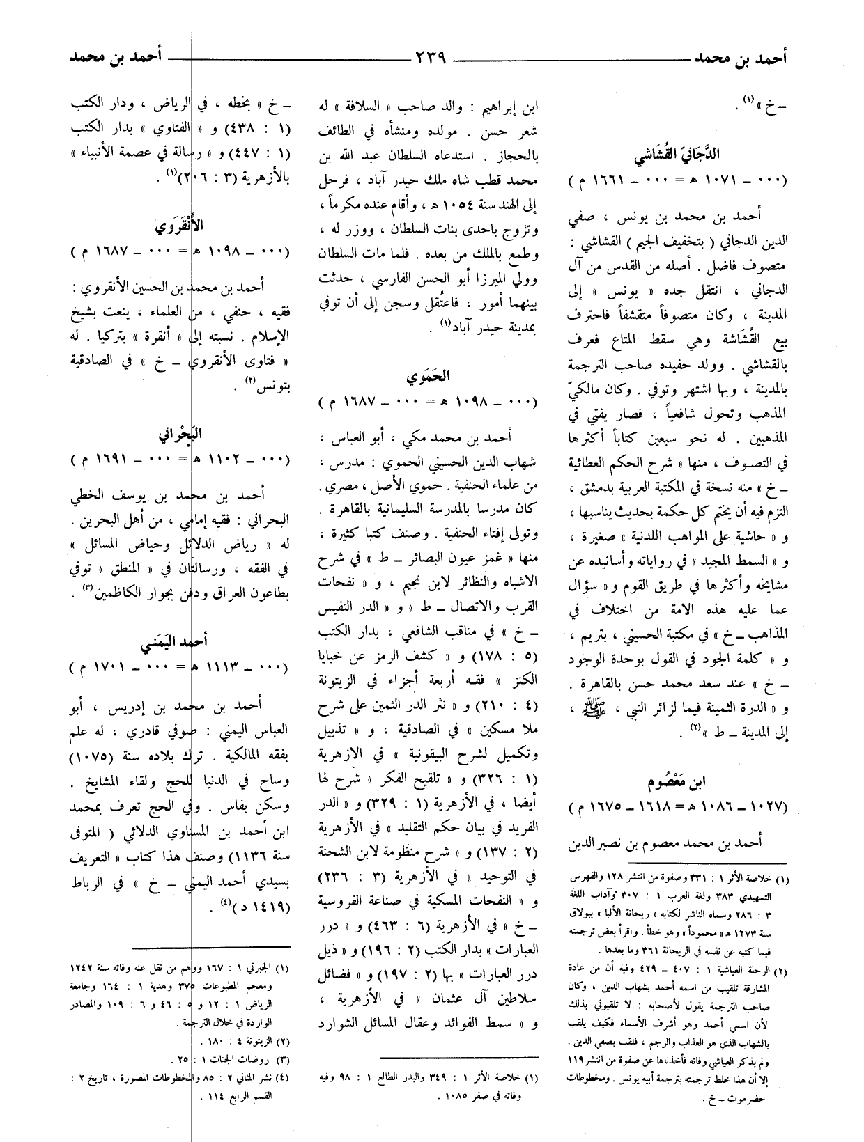(2) الرحلة العياشية 1: 407 - 429 وفيه أن من عادة المشارقة تلقيب من اسمه أحمد بشهاب الدين، وكان صاحب الترجمة يقول لأصحابه: لا تلقبوني بذلك لأن اسمي أحمد وهو أشرف الأسماء فكيف يلقب بالشهاب الّذي هو العذاب والرجم، فلقب بصفي الدين. ولم يذكر العياشي وفاته فأخذناها عن صفوة من انتشر 119 إلا أن هذا خلط ترجمته بترجمة أبيه يونس. ومخطوطات حضرموت - خ.
