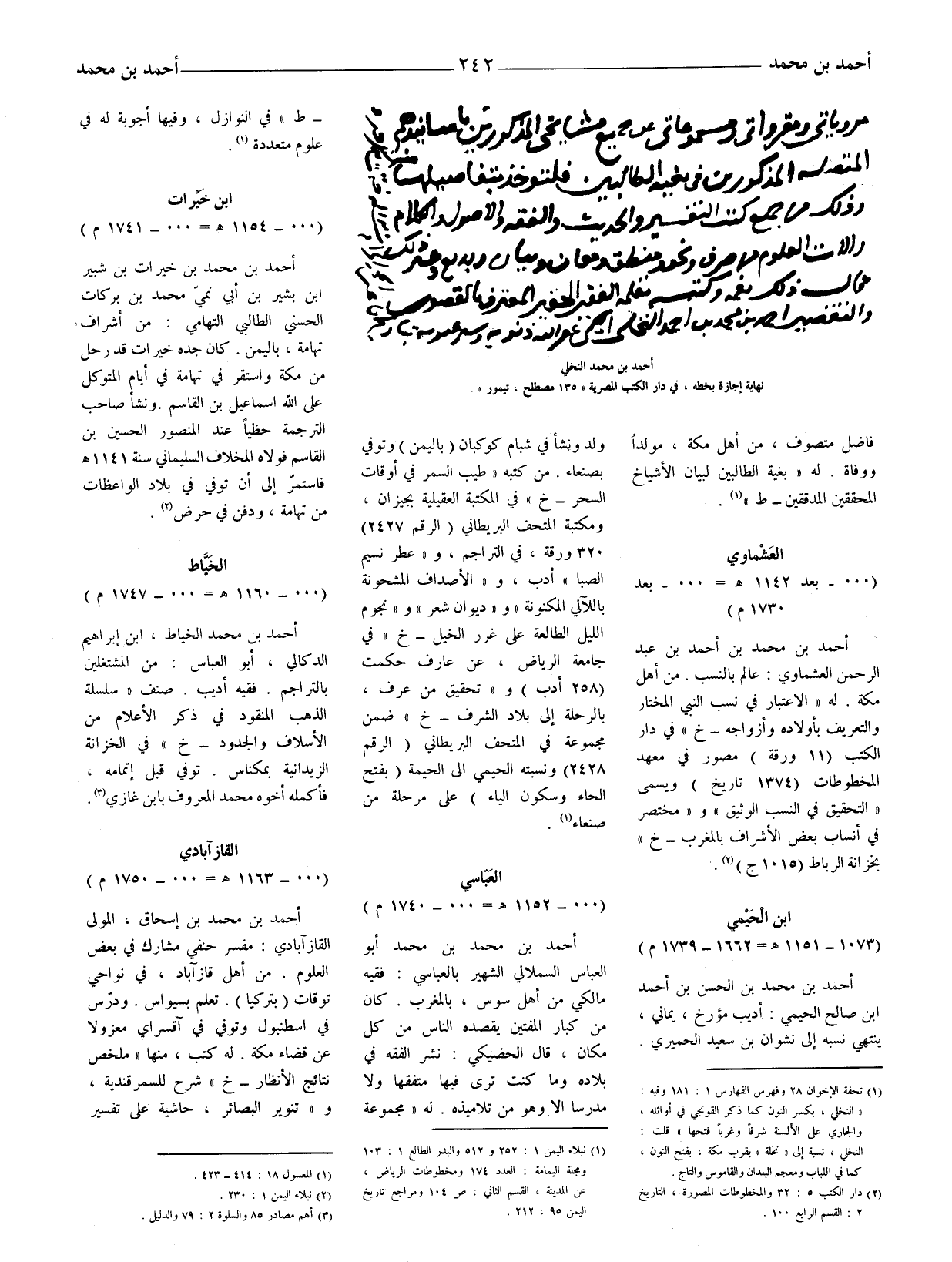 (1) تحفة الإخوان 28 وفهرس الفهارس 1: 181 وفيه: (النخلي، بكسر النون كما ذكر القونجي في أوائله، والجاري على الألسنة شرقا وغربا فتحها) قلت: النخلي، نسبة إلى (نخلة) بقرب مكة، بفتح النون، كما في اللباب ومعجم البلدان والقاموس والتاج.