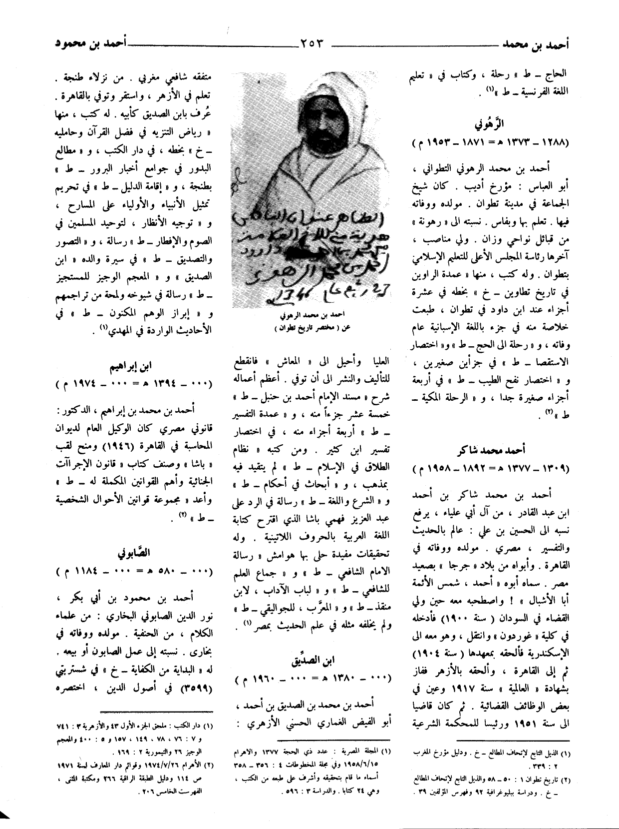 أحمد بن محمد الرهوني التطواني، أبو العباس: مؤرخ أديب. كان شيخ الجماعة في مدينة تطوان. مولده ووفاته فيها تعلم بها وبفاس. نسبته إلى (رهونة) من قبائل نواحي وزان. ولي مناصب، آخرها رئاسة المجلس الأعلى للتعليم الإسلامي بتطوان. وله كتب، منها (عمدة الراوين في تاريخ تطاوين - خ) بخطه في عشرة أجزاء عند ابن داود في تطوان، طبعت خلاصة منه في جزء باللغة الإسبانية عام وفاته، و (رحلة إلى الحج - ط) و (اختصار الاستقصا - ط) في جزأين صغيرين، و (اختصار نفح الطيب - ط) في أربعة أجزاء صغيرة جدا،