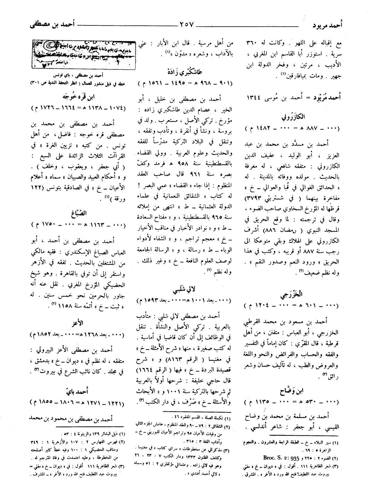 أحمد بن مصطفى بن خليل: أبو الخير، عصام الدين طاشكبري زاده: مؤرخ. تركي الأصل، مستعرب. ولد في بروسة، ونشأ في أنقرة، وتأدب وتفقه، وتنقل في البلاد التركية مدرّسا للفقه والحديث وعلوم العربية. وولي القضاء بالقسطنطينية سنة 958هـ فرمد وكف بصره سنة 961 قال صاحب العقد المنظوم: إذا جاء (القضاء) عمي البصر! له كتاب (الشقائق النعمانية في علماء الدولة العثمانية - ط) انتهى من إملائه سنة 965 بالقسطنطينية، و (مفتاح السعادة - ط) و (نوادر الأخبار في مناقب الأخيار - خ) معجم تراجم، و (الشفاء لا دواء الوباء - ط) رسالة، و (الرسالة الجامعة لوصف العلوم النافعة - خ) وغير ذلك.
