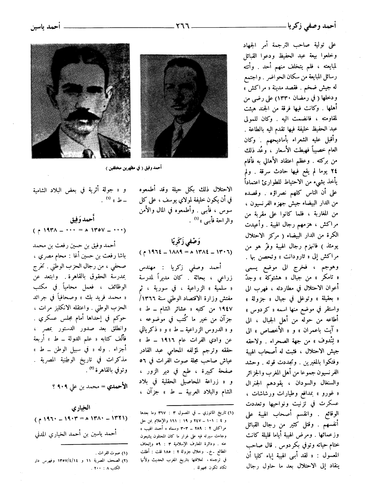 أحمد وصفي زكريا: مهندس زراعي، بحاثة. كان مديرا لمدرسة (سلمية) الزراعية، في سورية، ثم مفتش وزارة الاقتصاد الوطني سنة 1366 / 1947 من كتبه (عشائر الشام - ط) جزآن من خير ما كُتب في موضوعة، و (الدروس الزراعية - ط) و (ذكرياتي عن وادي الفرات عام 1916 - ط) حققه وترجم لمؤلفه المحامي عبد القادر عيّاش صاحب مجلة صوت الفرات في 56 صفحة كبيرة، طبع في دير الزور، و (زراعة المحاصيل الحقلية في بلاد الشام والبلاد العربية - ط) جزآن،