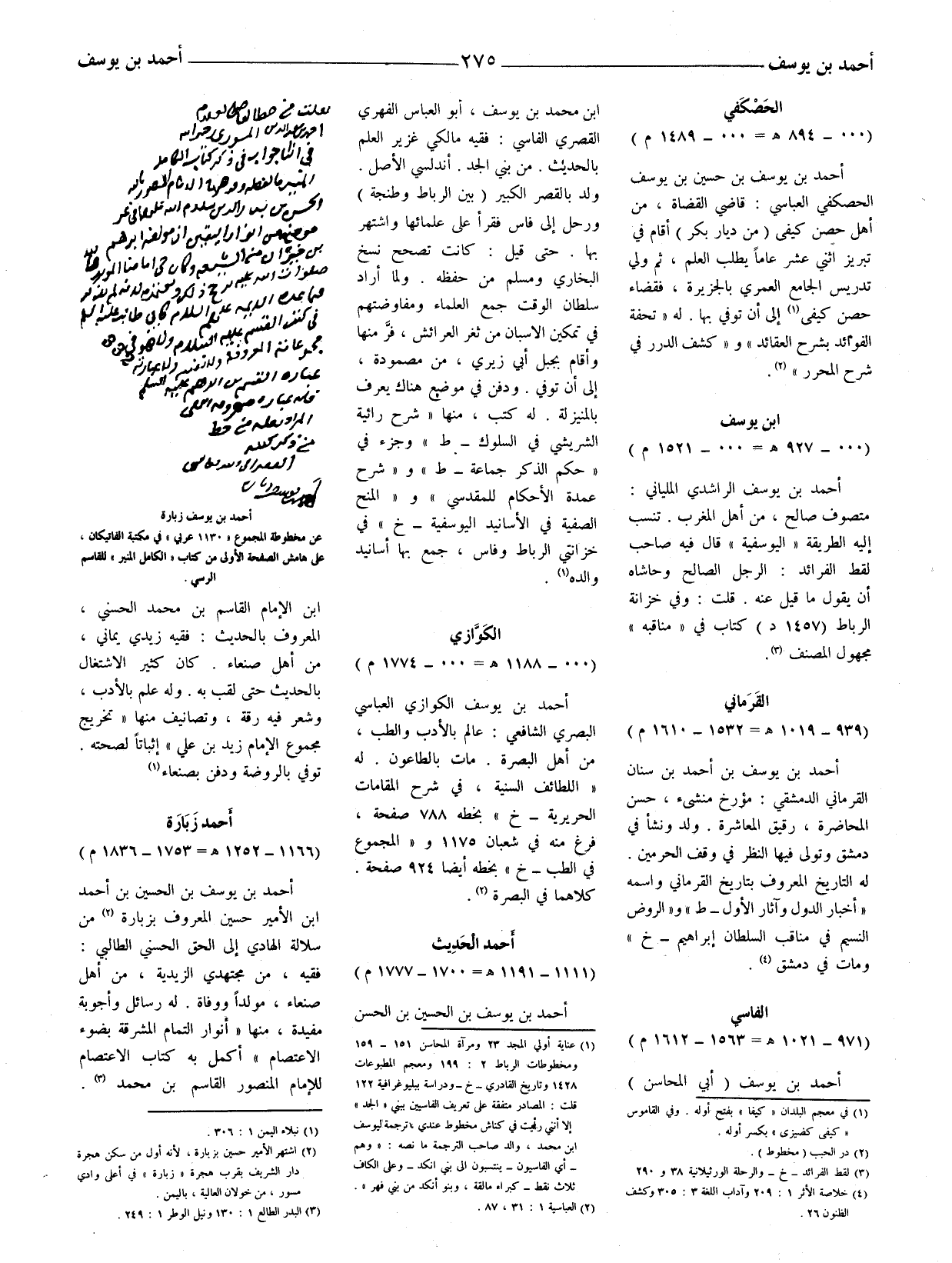 أحمد بن يوسف بن حسين بن يوسف الحصفكي العباسي: قاضي القضاة، من أهل حصن كيفى (من ديار بكر) أقام في تبريز اثني عشر عاما يطلب العلم، ثم ولي تدريس الجامع العمري بالجزيرة، فقضاء حصن كيفى (1) إلى أن توفي بها. له (تحفة الفوائد بشرح العقائد) و (كشف الدرر في شرح المحرر) (2) .