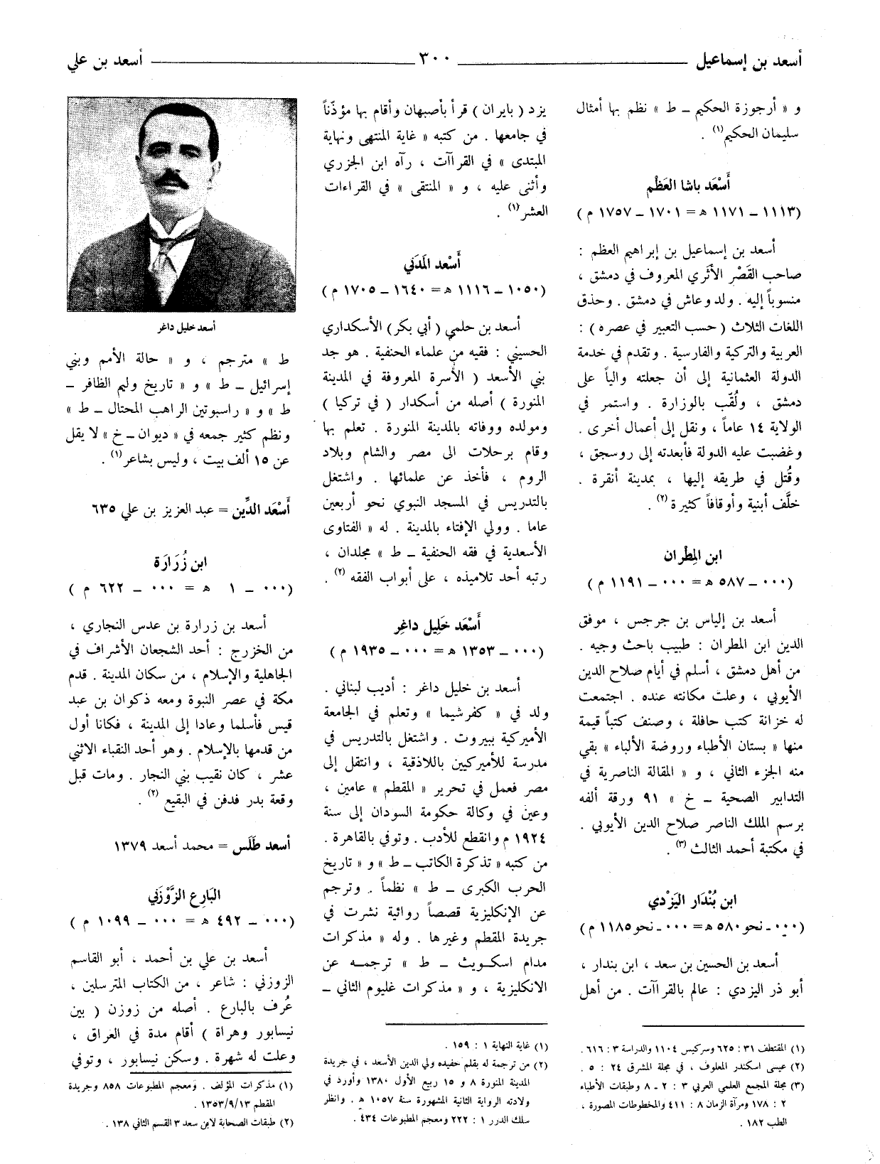 (2) من ترجمة له بقلم حفيده ولي الدين الأسعد، في جريدة المدينة المنورة 8 و 15 ربيع الأول 1380 وأورد في ولادته الرواية الثانية المشهورة سنة 1057 هـ وانظر سلك الدرر 1: 222 ومعجم المطبوعات 434.