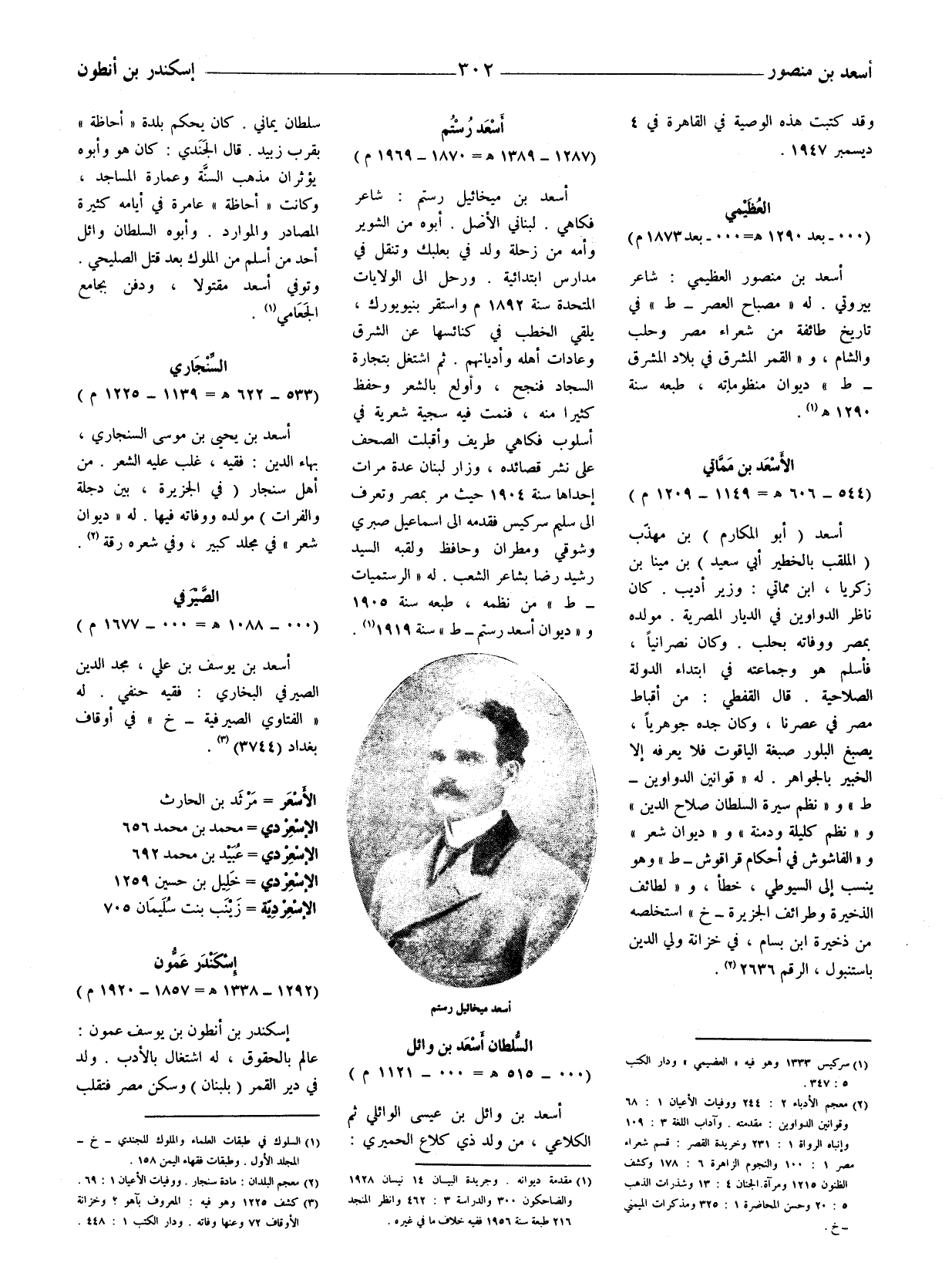 أسعد بن ميخائيل رستم: شاعر فكاهي. لبناني الأصل. أبوه من الشوير وأمه من زحلة ولد في بعلبكّ وتنقل في مدارس ابتدائية. ورحل إلى الولايات المتحدة سنة 1892 م واستقر بنيويورك، يلقي الخطب في كنائسها عن الشرق وعادات أهله وأديانهم. ثم اشتغل بتجارة السجاد فنجح، وأولع بالشعر وحفظ كثيرا منه، فنمت فيه سجية شعرية في أسلوب فكاهي طريف وأقبلت الصحف على نشر قصائده، وزار لبنان عدة مرات إحداها سنة 1904 حيث مر بمصر وتعرف الى سليم سركيس فقدمه الى إسماعيل صبري وشوقي ومطران وحافظ ولقبه السيد رشيد رضا بشاعر الشعب. له (الرستميات - ط) من نظمه، طبعه سنة 1905 و (ديوان أسعد رستم - ط) سنة 1919 (1) .