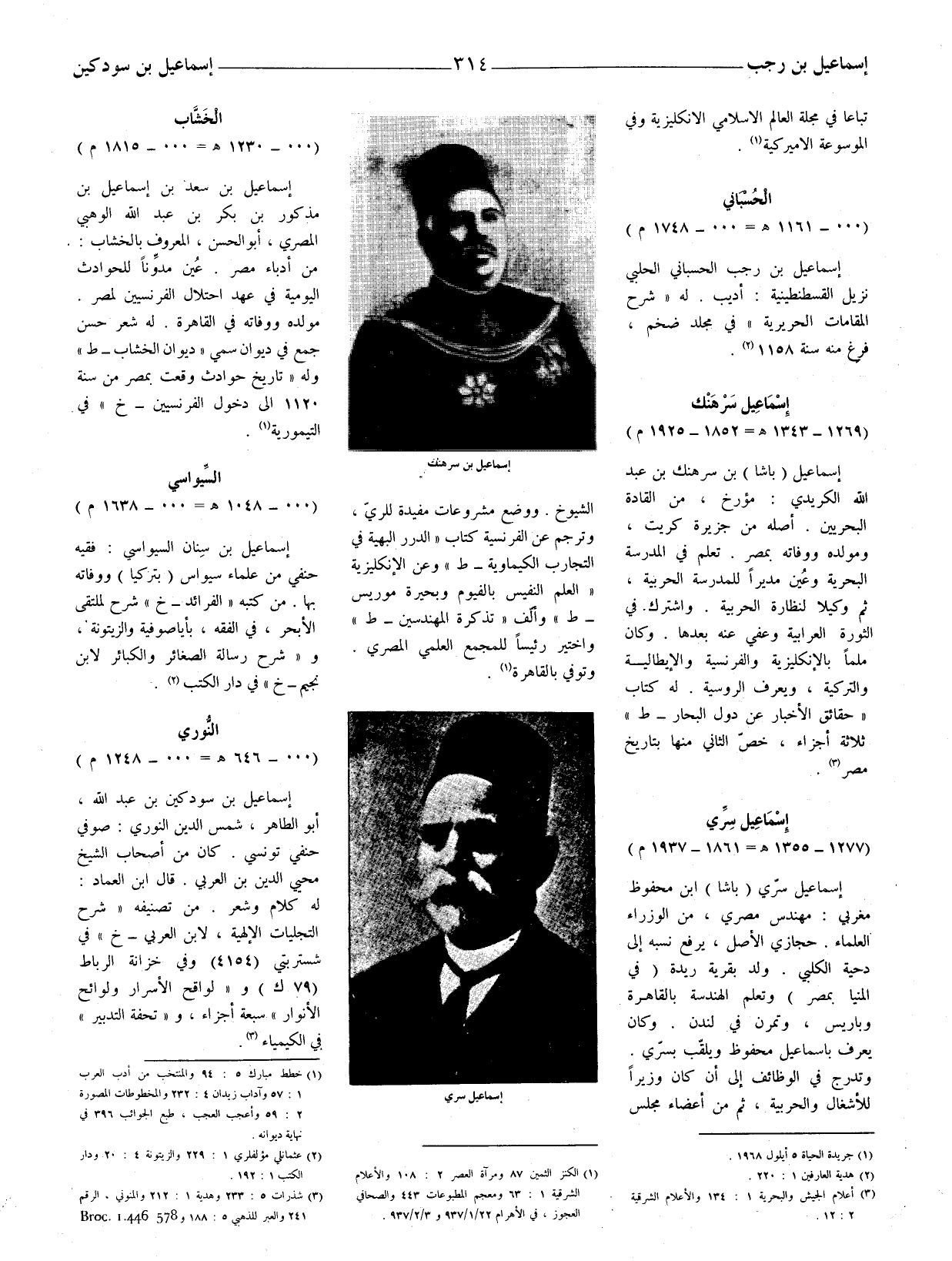 إسماعيل سرّي (باشا) ابن محفوظ مغربي: مهندس مصري، من الوزراء العلماء. حجازي الأصل، يرفع نسبه إلى دحية الكلبي. ولد بقرية ريدة (في المنيا بمصر) وتعلم الهندسة بالقاهرة وباريس، وتمرن في لندن. وكان يعرف بإسماعيل محفوظ ويلقّب بسرّي. وتدرج في الوظائف إلى أن كان وزيرا للاشغال والحربية، ثم من أعضاء مجلس