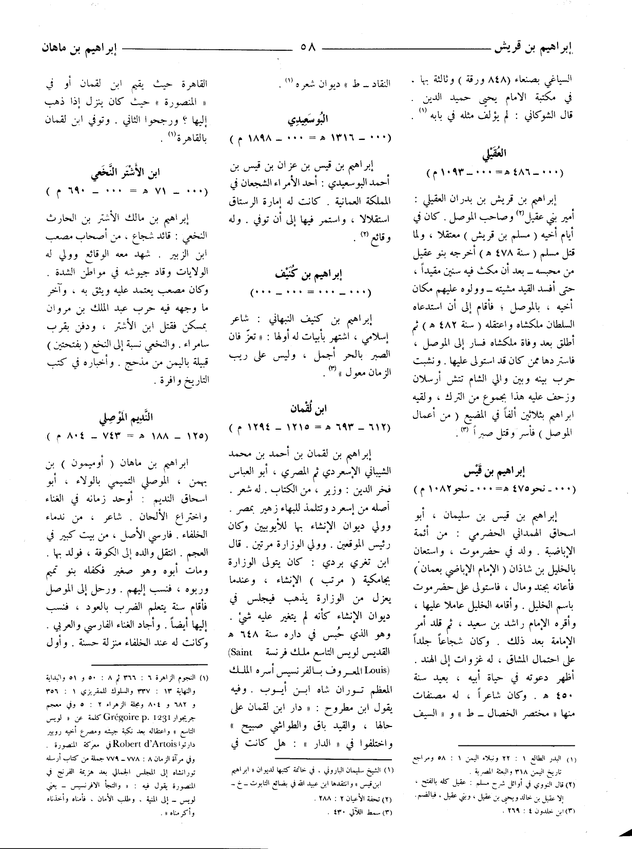 إبراهيم بن قريش بن بدران العقيلي: أمير بني عقيل (2) وصاحب الموصل. كان في أيام أخيه (مسلم بن قريش) معتقلا، ولما قتل مسلم (سنة 478 هـ أخرجه بنو عقيل من محبسه - بعد أن مكث فيه سنين مقيدا، حتى أفسد القيد مشيته - وولوه عليهم مكان أخيه، بالموصل، فأقام إلى أن استدعاه السلطان ملكشاه واعتقله (سنة 482 هـ ثم أطلق بعد وفاة ملكشاه فسار إلى الموصل، فاستردها ممن كان قد استولى عليها. ونشبت حرب بينه وبين والي الشام تتش أرسلان وزحف عليه هذا بجموع من الترك، ولقيه إبراهيم بثلاثين ألفا في المضيع (من أعمال الموصل) فأسر وقتل صبرا (3) .