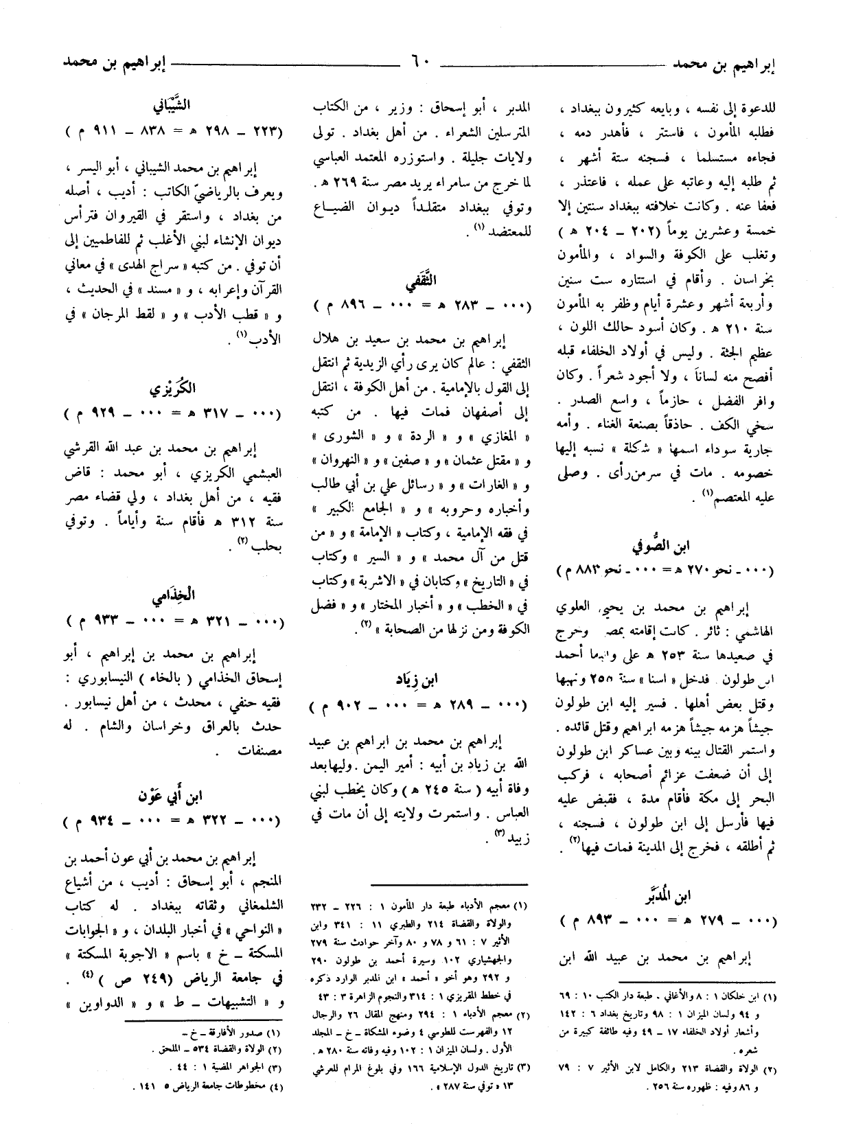 (1) معجم الأدباء طبعة دار المأمون 1: 226 - 232 والولاة والقضاة 214 والطبري 11: 341 وابن الأثير 7: 61 و 78 و 80 وآخر حوادث سنة 279 والجهشياري 102 وسيرة أحمد بن طولون 290 و 292 وهو أخو (أحمد) ابن المدبر الوارد ذكره في خطط المقريزي 1: 314 النجوم الزاهرة 3: 43