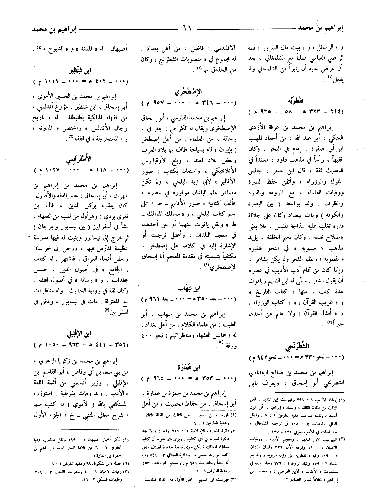 (2) الفهرست لابن النديم. ومعجم الأدباء. ووفيات الأعيان 1: 11 ونزهة الالبا 326 ولسان الميزان 1: 109 وفيه (نفطويه على وزن سيبويه) وتاريخ بغداد 6: 159 وإنباه الرواة 1: 176 وجاء اسمه في مخطوطة (الألقاب) لابن الفرضيّ: (محمد بن إبراهيم) خلافا لسائر المصادر؟