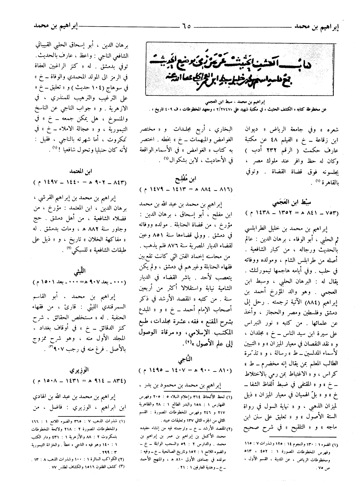(2) المقصد الأرشد - خ - وترجمته فيه من إنشاء حفيده محمد الأكمل بن إبراهيم بن عمر بن إبراهيم بن محمد. والدارس 2: 59 والسحب الوابلة - خ - والضوء اللامع 1: 152 وتاريخ الصالحية - خ - وفيه: مولده في جمادى الأولى 810 هـ والمنهج الأحمد - خ - وهدية العارفين 1: 21.