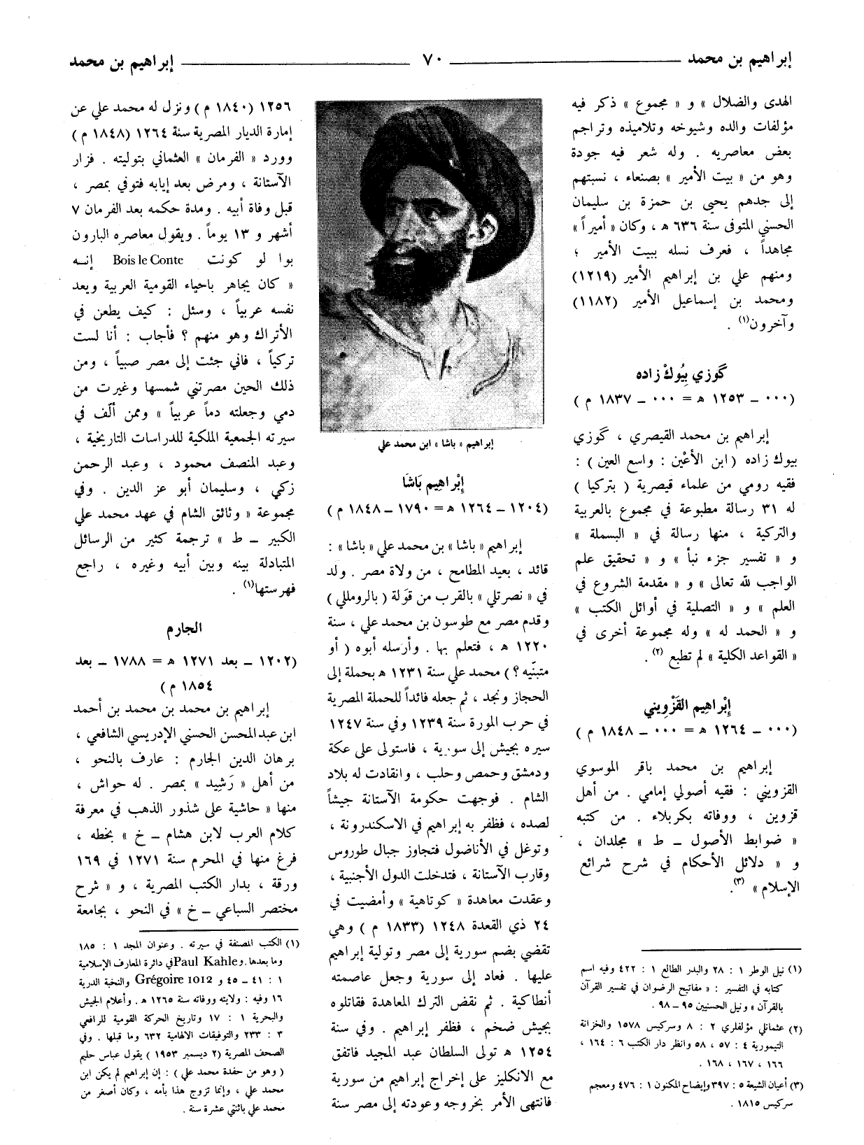 (1) الكتب المصنفة في سيرته. وعنوان المجد 1: 185 وما بعدها. وPaul Kahle في دائرة المعارف الإسلامية 1: 41 - 45 و 2 Gregoire IOI والنخبة الدرية 16 وفيه: ولايته ووفاته سنة 1265 هـ وأعلام الجيش والبحرية 1: 17 وتاريخ الحركة القومية للرافعي3: 233