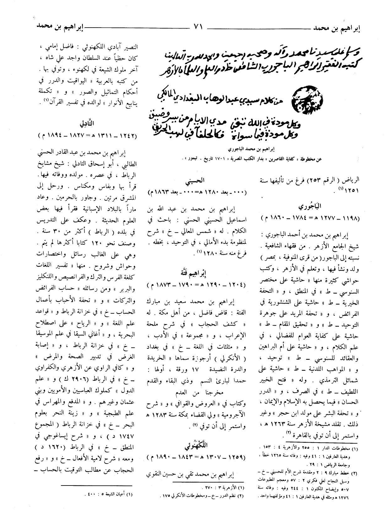 إبراهيم بن محمد بن أحمد الباجوري: شيخ الجامع الأزهر. من فقهاء الشافعية. نسبته إلى الباجور (من قرى المنوفية، بمصر) ولد ونشأ فيها، وتعلم في الأزهر، وكتب حواشي كثيرة منها (حاشية على مختصر السنوسي - ط) في المنطق، و (التحفة الخيرية - ط) حاشية على الشنشورية في الفرائض، و (تحفة المريد على جوهرة التوحيد - ط) و (تحقيق المقام - ط) حاشية على كفاية العوام للفضالي، في علم الكلام، و (حاشية على أم البراهين والعقائد للسنوسي - ط) توحيد،