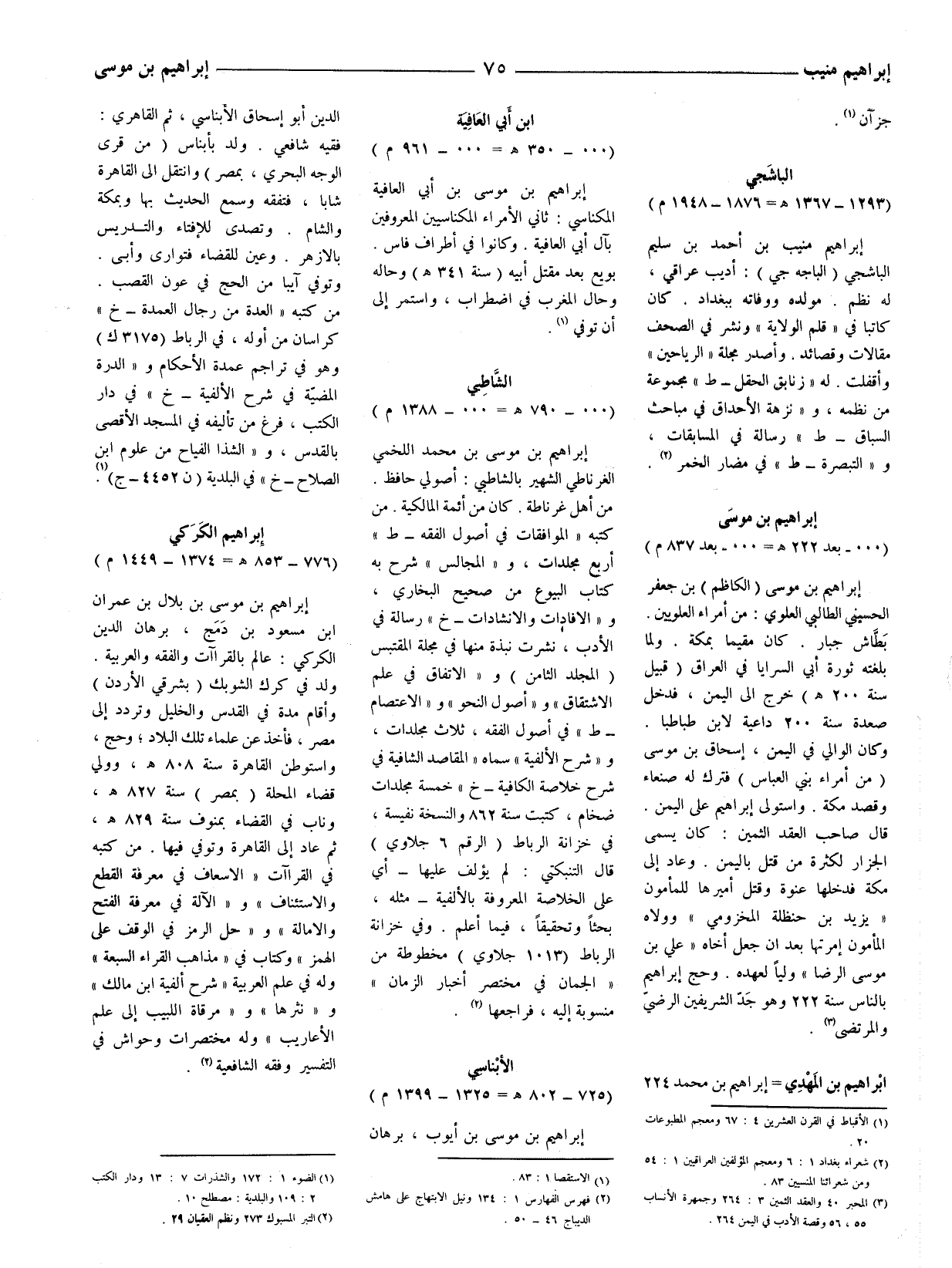 إبراهيم بن موسى بن محمد اللخمي الغرناطي الشهير بالشاطي: أصولي حافظ. من أهل غرناطة. كان من أئمة المالكية. من كتبه (الموافقات في أصول الفقه - ط) أربع مجلدات، و (المجالس) شرح به كتاب البيوع من صحيح البخاري، و (الافادت والانشادات - خ) رسالة في الأدب، نشرت نبذة منها في مجلة المقتبس (المجلد الثامن) و (الاتفاق في علم الاشتقاق) و (أصول النحو) و (الاعتصام - ط) في أصول الفقه، ثلاث مجلدات، و (شرح الألفية) سماه (المقاصد الشافية في شرح خلاصة الكافية - خ) خمسة مجلدات ضخام، كتبت سنة 862 والنسخة نفيسة، في خزانة الرباط (الرقم 6 جلاوي) قال التنبكتي: لم يؤلف عليها - أي على الخلاصة المعروفة بالألفية - مثله، بحثا وتحقيقا، فيما أعلم. وفي خزانة الرباط (1013 جلاوي) مخطوطة من (الجمان في مختصر أخبار الزمان) منسوبة إليه، فراجعها (2) .