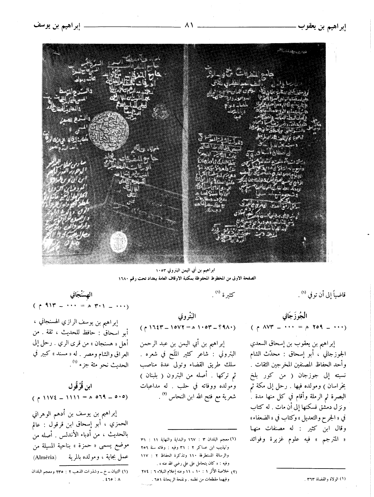 (1) معجم البلدان 3: 167 والبداية والنهاية 11: 31 وتهذيب ابن عساكر 2: 31 وفيه: وفاته سنة 256 والرسالة والمستطرفة 110 وتذكرة الحفاظ 2: 117 وفيه: (كان يتحامل على علي رضي الله عنه) .
