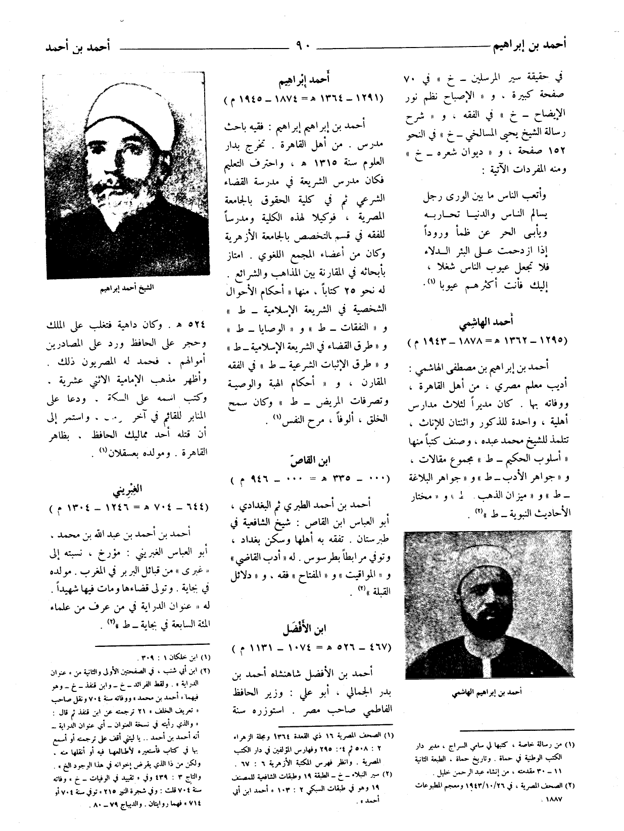 (1) الصحف المصرية 16 ذي القعدة 1364 ومجلة الزهراء 2: 508 ثم 4: 295 وفهارس المؤلفين في دار الكتب المصرية. وانظر فهرس المكتبة الأزهرية 6: 67.
