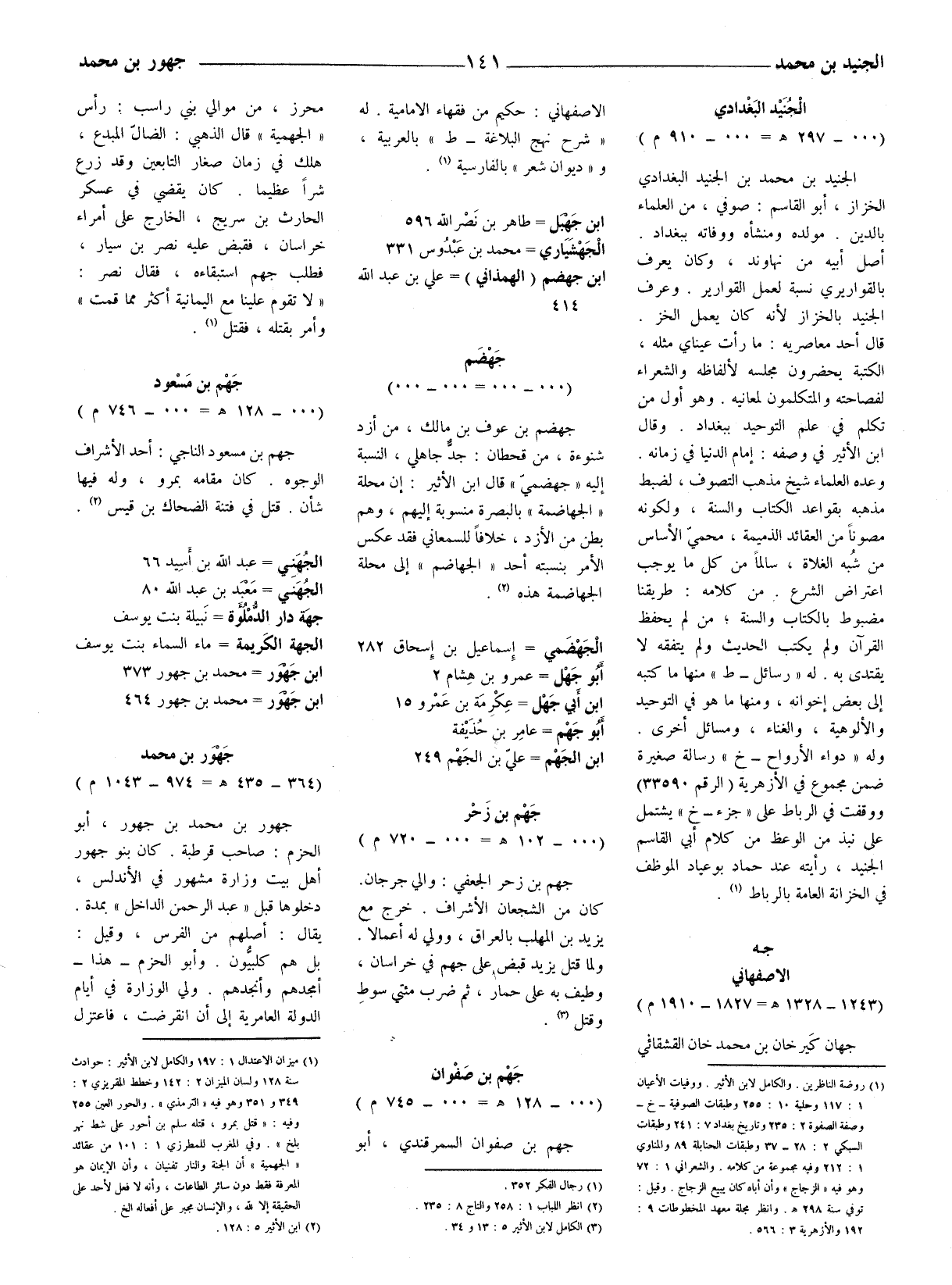 (1) ميزان الاعتدال 1: 197 والكامل لابن الأثير: حوادث سنة 128 ولسان الميزان 2: 142 وخطط المقريزي 2: 349 و 351 وهو فيه (الترمذي) . والحور العين 255 وفيه: (قتل بمرو، قتله سلم بن أحور على شط نهر بلخ) . وفي المغرب للمطرزي 1: 101 من عقائد (الجهمية) أن الجنة والنار تفنيان، وأن الإيمان هو المعرفة فقط دون سائر الطاعات، وأنه لافعل لأحد على الحقيقة إلا للَّه، والإنسان مجبر على أفعاله إلخ.