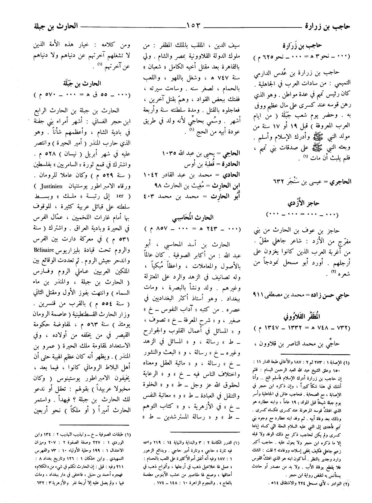 (1) الإصابة 1: 273 ثم 2: 187 والأغاني طبعة الدار 11: 150 وعلق الشيخ عبد الله العبد الرحمن البسام: قلتم إن حاجب بن زرارة أدرك الإسلام فأسلم إلخ..وأنا أشك في هذا شكا كبيرا، وإن ذكره ابن حجر في الإصابة، مع الصحابة. فحاجب عاش في الجاهلية وأسر يوم جبلة شيخا قبل المولد ب 19 عاما، وابنه عطارد هو الّذي افتكّ قوسه المرهونة عند كسرى فكساه كسرى.