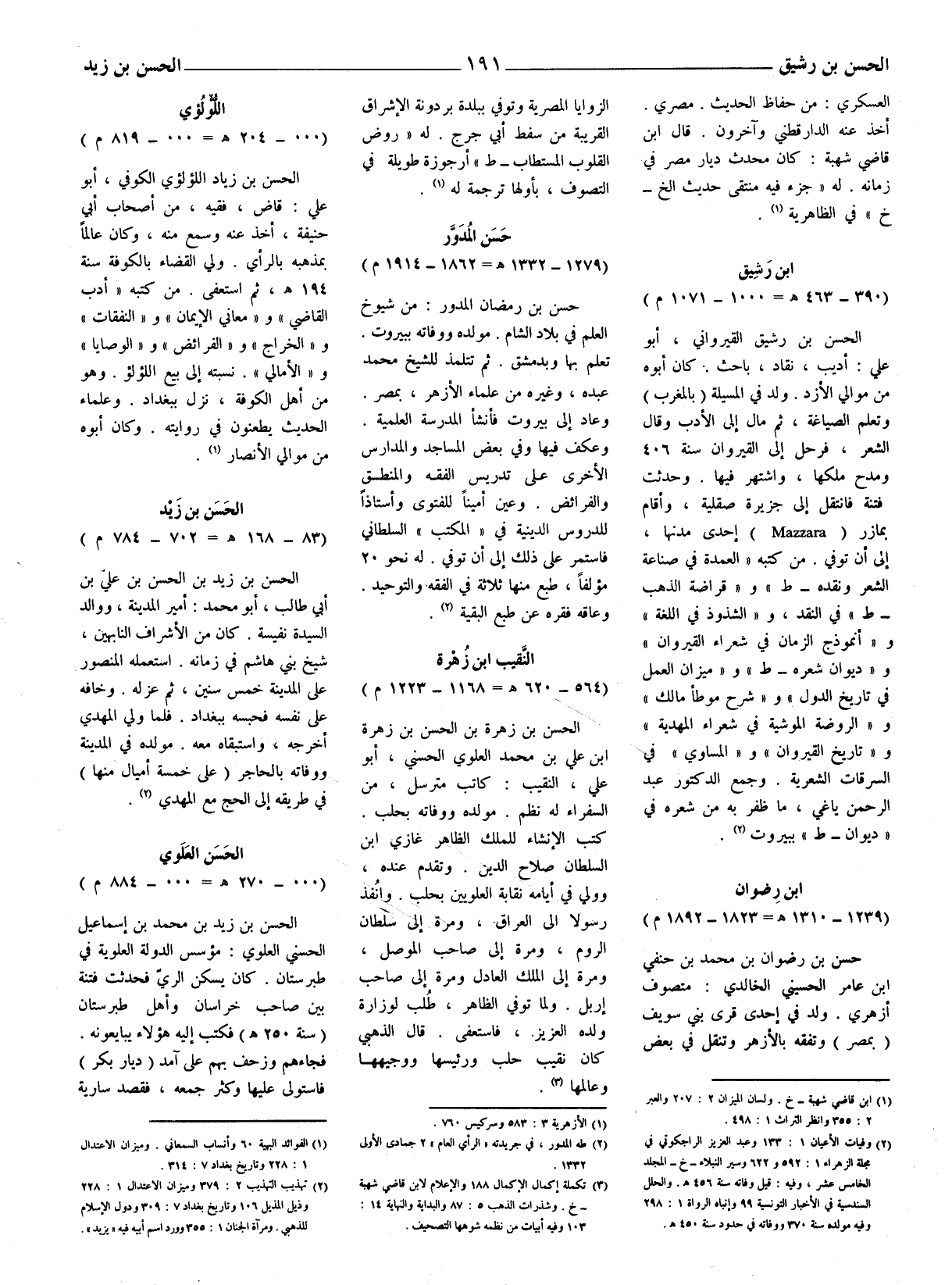 (2) وفيات الأعيان 1: 133 وعبد العزيز الراجكوتي في مجلة الزهراء 1: 592 و 622 وسير النبلاء - خ - المجلد الخامس عشر، وفيه: قيل وفاته سنة 456هـ والحلل السندسية في الأخبار التونسية 99 وإنباه الرواة 1: 298 وفيه مولده سنة 370 ووفاته في حدود سنة 450 هـ