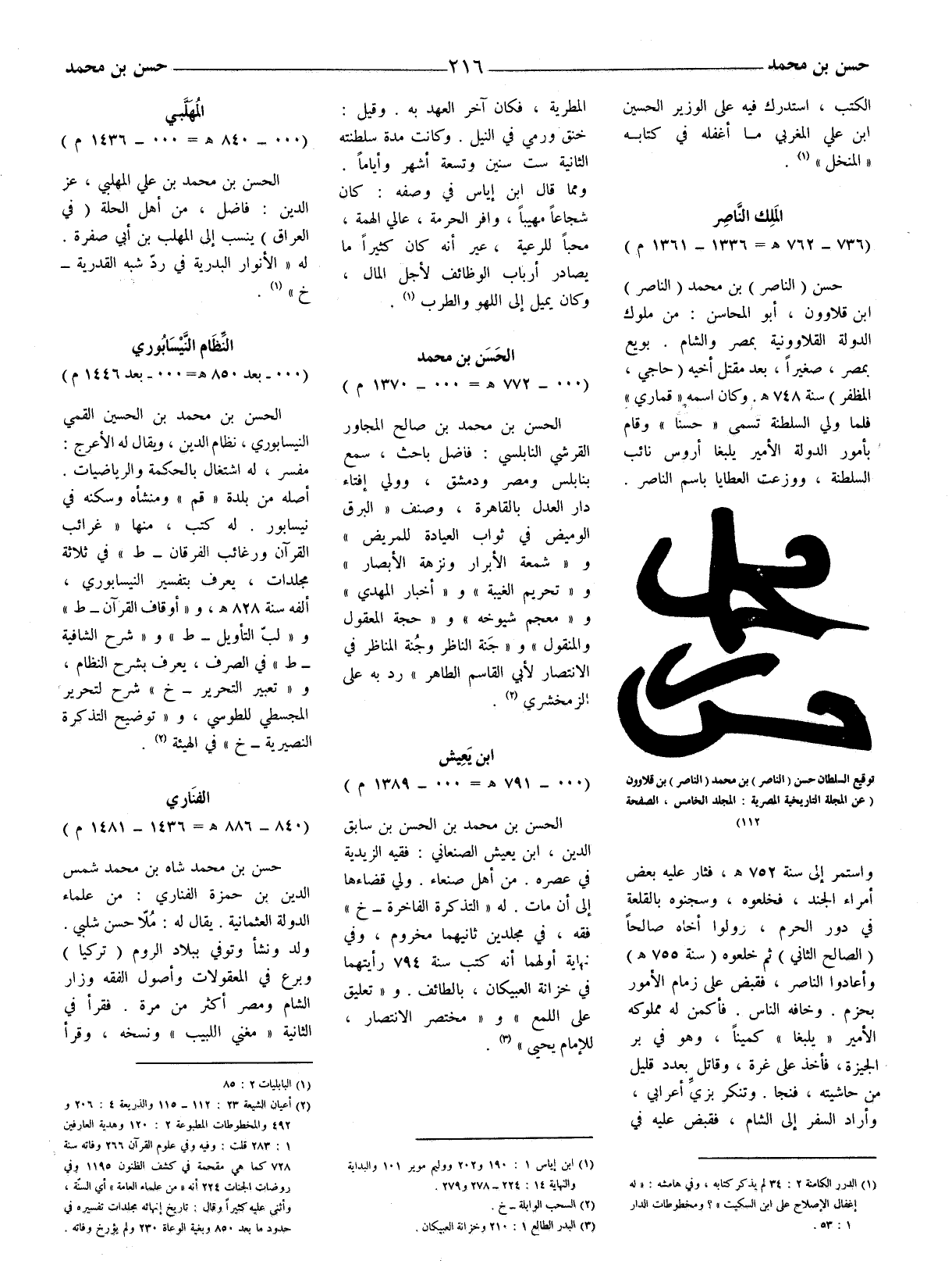 حسن (الناصر) بن محمد (النَّاصِر) ابن قلاوون، أبو المحاسن: من ملوك الدولة القلاوونية بمصر والشام. بويع بمصر، صغيرا، بعد مقتل أخيه (حاجي، المظفر) سنة 748 هـ وكان اسمه (قماري) فلما ولي السلطنة تسمى (حسنا) وقام بأمور الدولة الأمير يلبغا أروس نائب السلطنة، ووزعت العطايا باسم الناصر. واستمر إلى سنة 752 هـ فثار عليه بعض أمراء الجند، فخلعوه، وسجنوه بالقلعة في دور الحرم، وولوا أخاه صالحا (الصالح الثاني) ثم خلعوه (سنة 755 هـ وأعادوا الناصر، فقبض على زمام الأمور بحزم. وخافه الناس. فأكمن له مملوكه الأمير (يلبغا) كمينا، وهو في بر الجيزة، فأخذ على غرة، وقاتل بعدد قليل من حاشيته، فنجا. وتنكر بزيّ أعرابي، وأراد السفر إلى الشام، فقبض عليه في