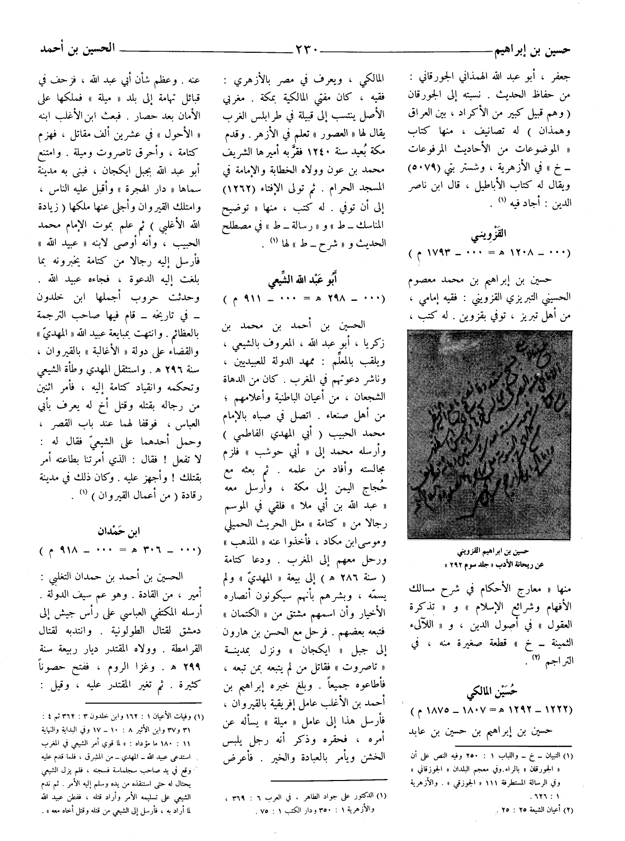 (1) وفيات الأعيان 1: 162 وابن خلدون 3: 362 ثم 4: 31 و 37 وابن الأثير 8: 10 - 17 وفي البداية والنهاية 11: 180 مامؤداه: (لما قوي أمر الشيعي في المغرب استدعى عبيد الله - المهدي - من المشرق، فلما قدم عليه وقع في يد صاحب سجلماسة فسجنه، فلم يزل الشيعي يحتال له حتى استنقذه من يده وسلم إليه الأمر. ثم ندم الشيعي على تسليمه الأمر وأراد قتله، ففطن عبيد الله لما أراد به، فأرسل إلى الشيعي من قتله وقتل أخاه معه) .